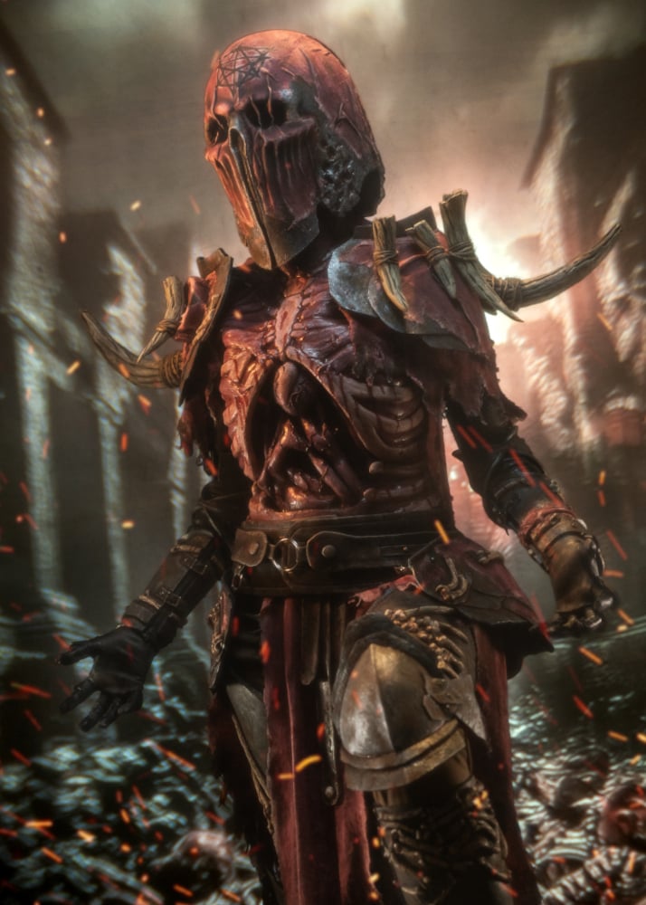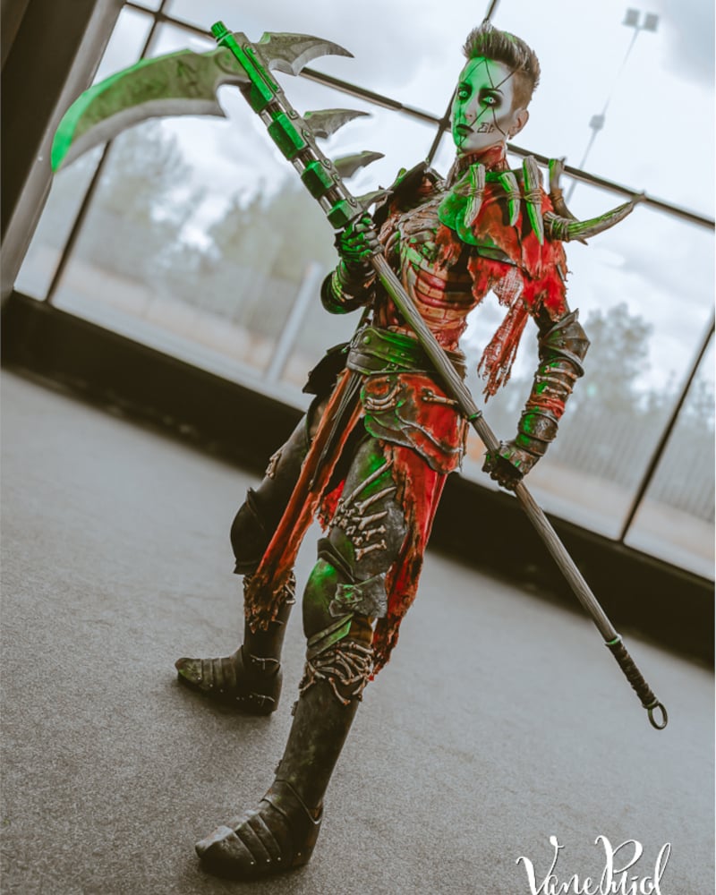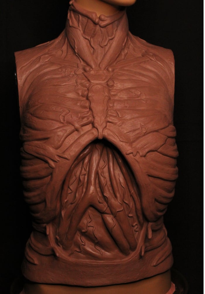 To make this character's armor, I used low-density EVA foam. All the details of the small bones are modeled one by one with foam clay. The shoulder bones are made with several sheets of EVA foam glued together and then sculpted with a cutter and rotary tool. The armor is attached to the body with sewn and glued Velcro. The belts are made of EVA foam covered with faux leather. The red fabric is linen, worn and stained with paint and burns. The lighter details are made with bleach. In some areas, such as the shoulder pads and helmet, the fabric is glued with white glue. The armor has texture to give it a rougher look, made with texture paste and painted with acrylic paint. The star of this cosplay is undoubtedly the torso. This piece is modeled entirely by hand with monster clay on a mannequin. Then I made a plaster mold in two parts. Next, I poured latex into the two molds. Once I had the two latex parts, I glued them to my body with more latex over a Lycra T-shirt. I made a cut on one side to put zippers in so I could put it on easily. The torso is painted with latex mixed with acrylic paint and alcohol-based inks. I made the heart separately because I wanted it to be detachable from the torso. It is made in the same way as the torso, modeled by hand with monster clay, and then with latex, but with the difference that it is filled with polyurethane foam to make it soft.