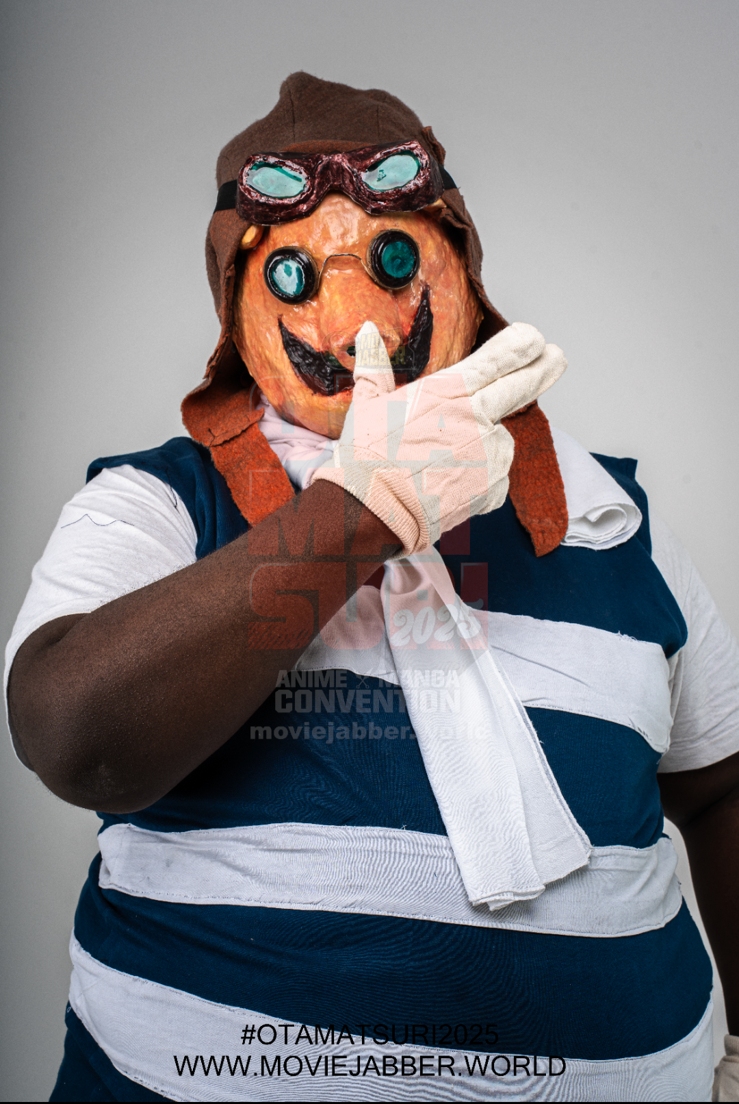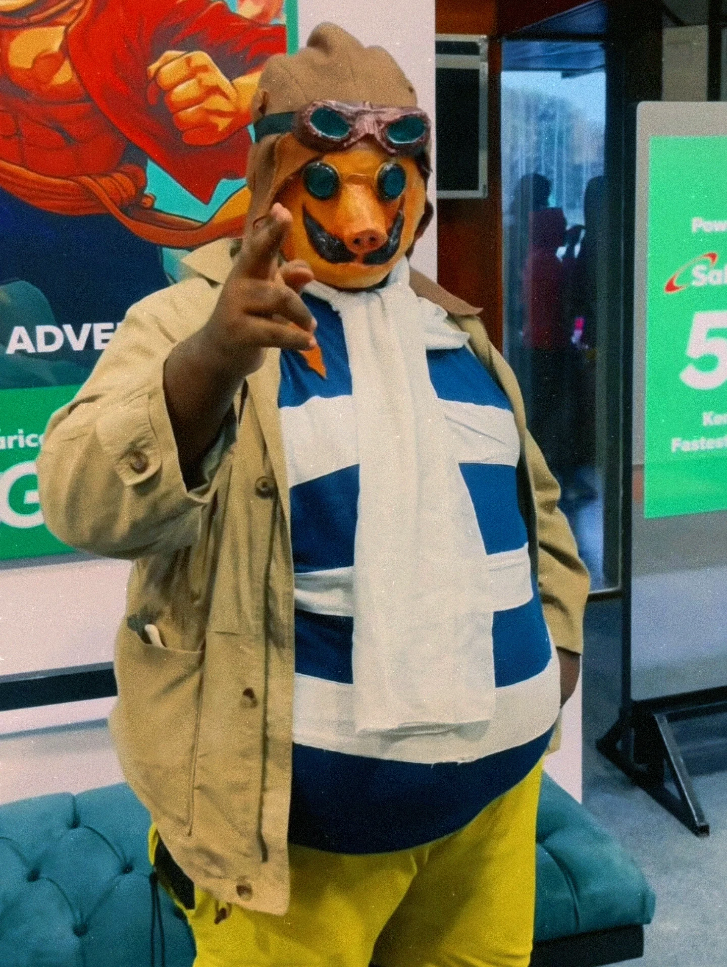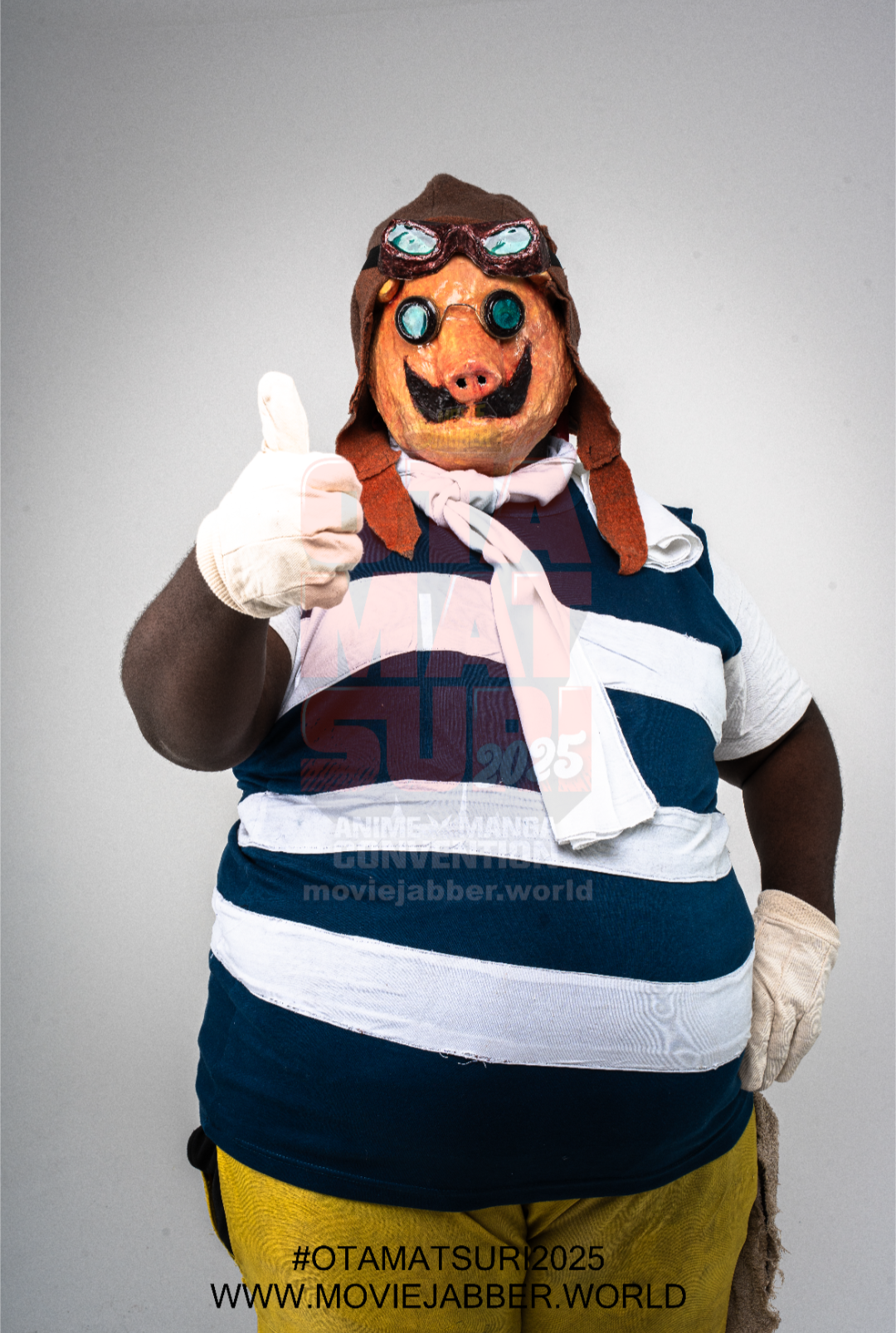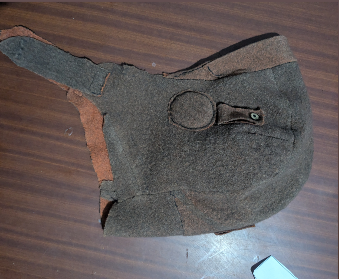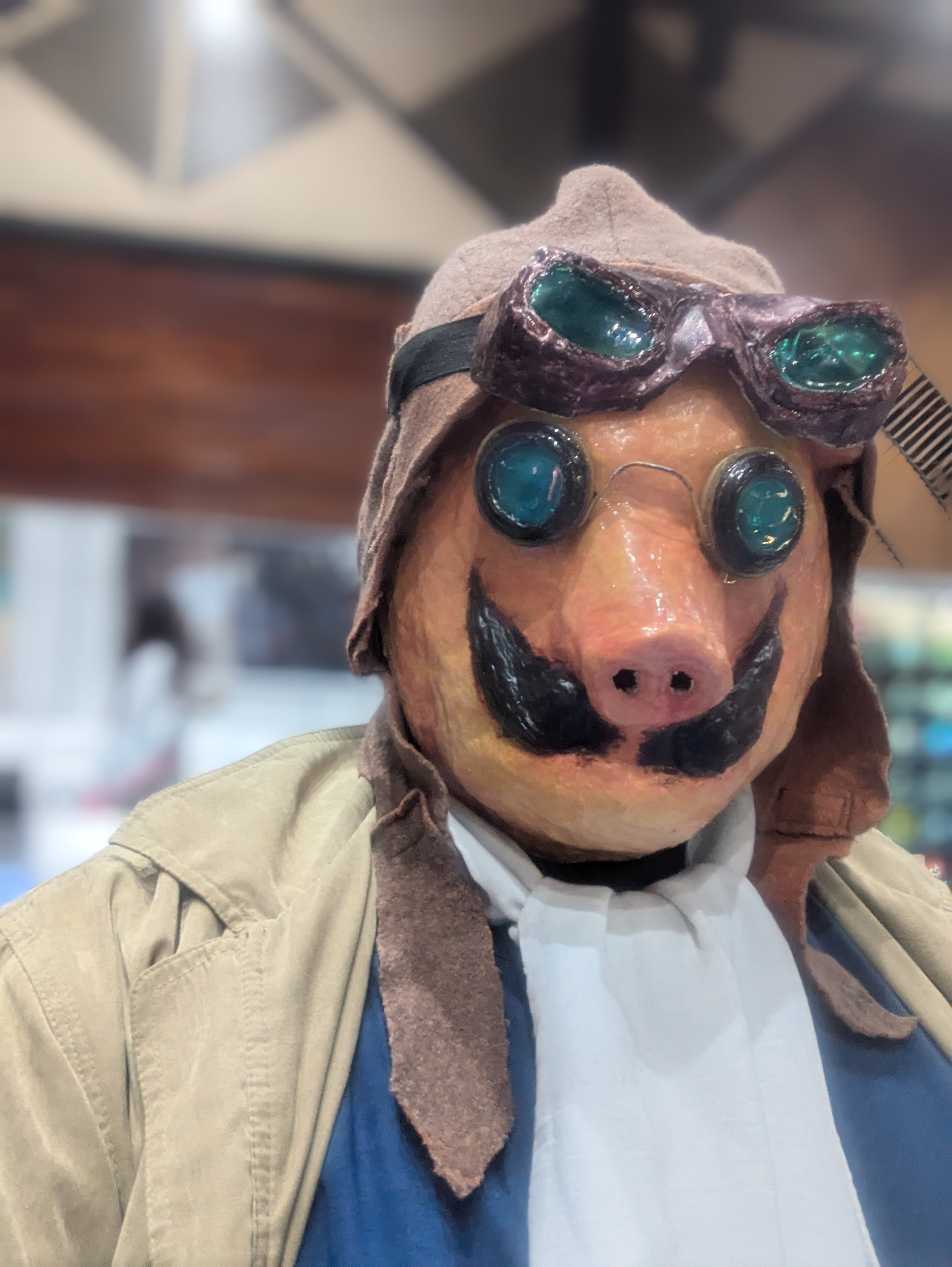 The aviator cap was patterned referencing period accurate caps. It was sewn using a felt-like fabric, then modifications were done to account for the pig features.