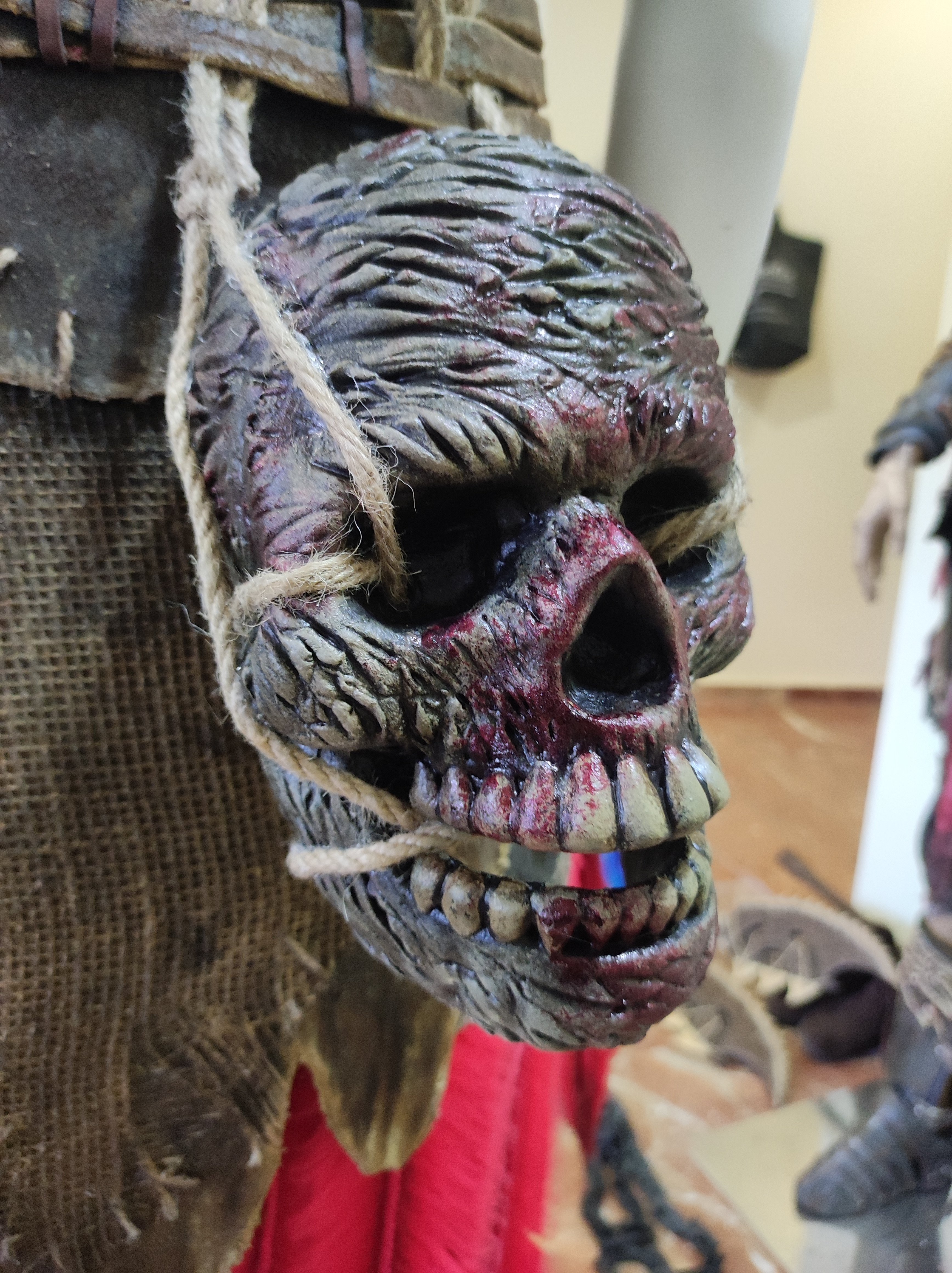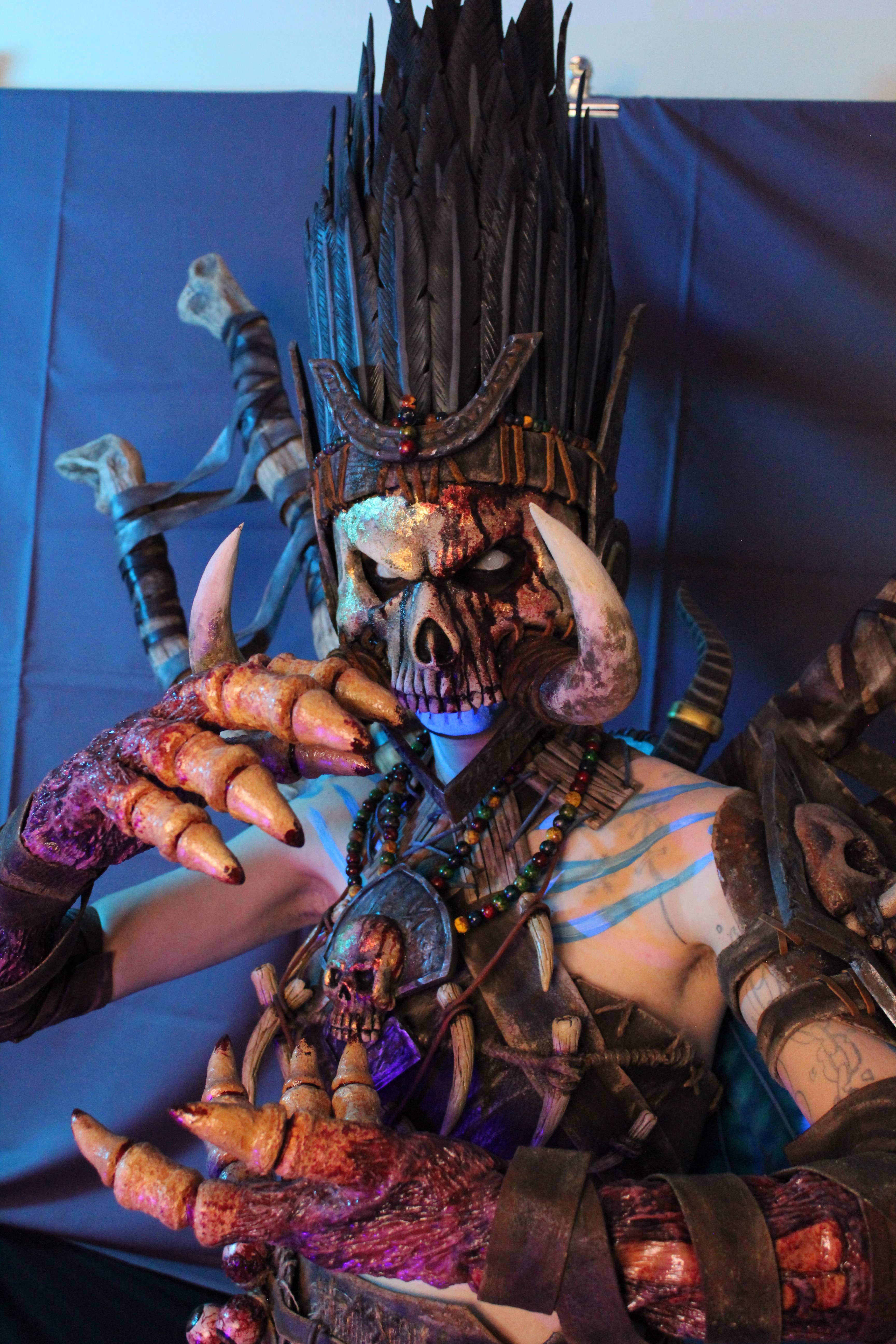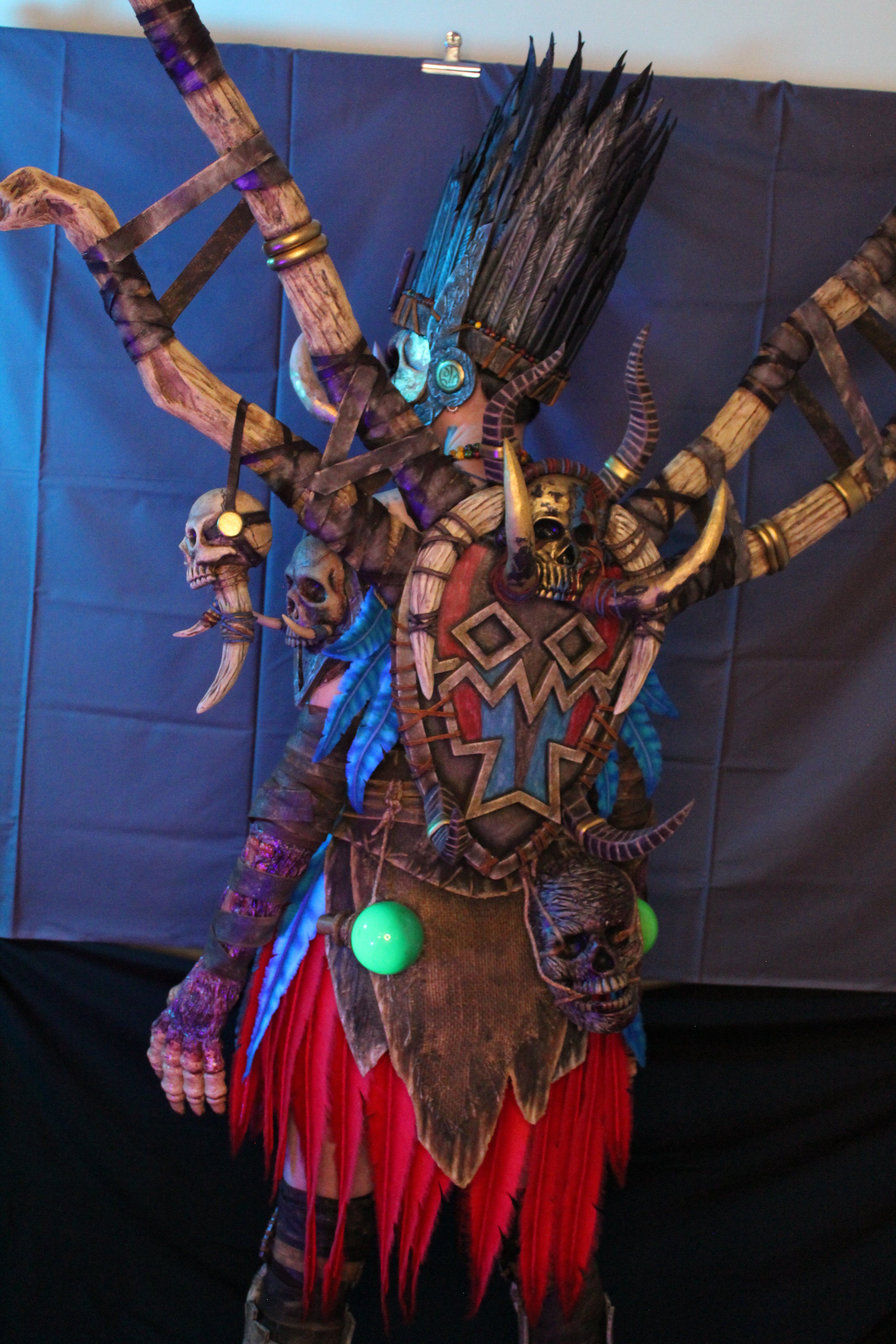 The skull is modeled with foam clay. The feathers on the head are made of EVA foam with wire inside. The base of the head, the horns, the skull, and all the other details are made of rubber. The skull on the necklace is modeled with foam clay.