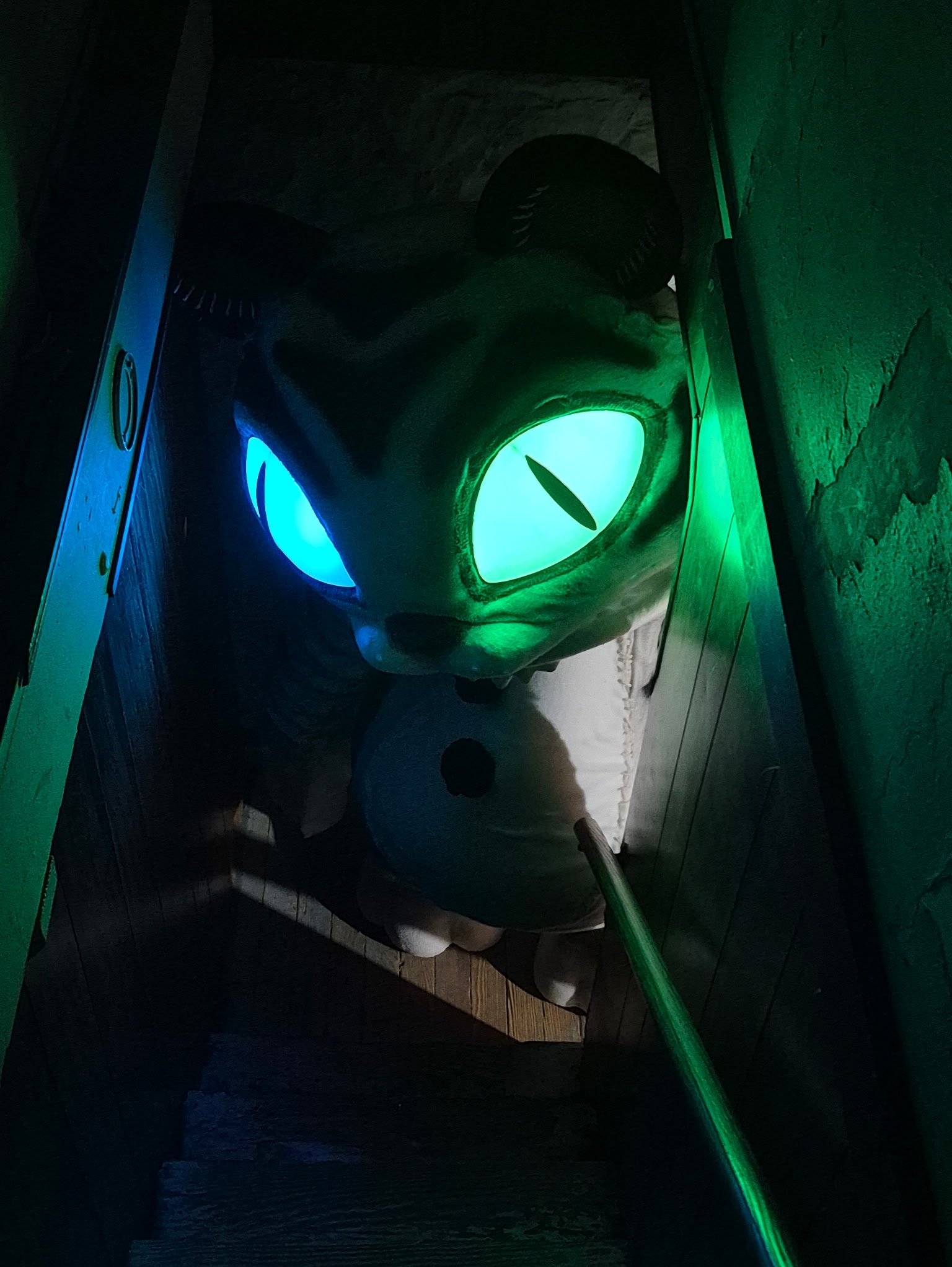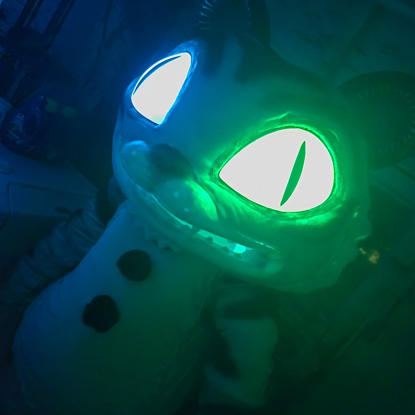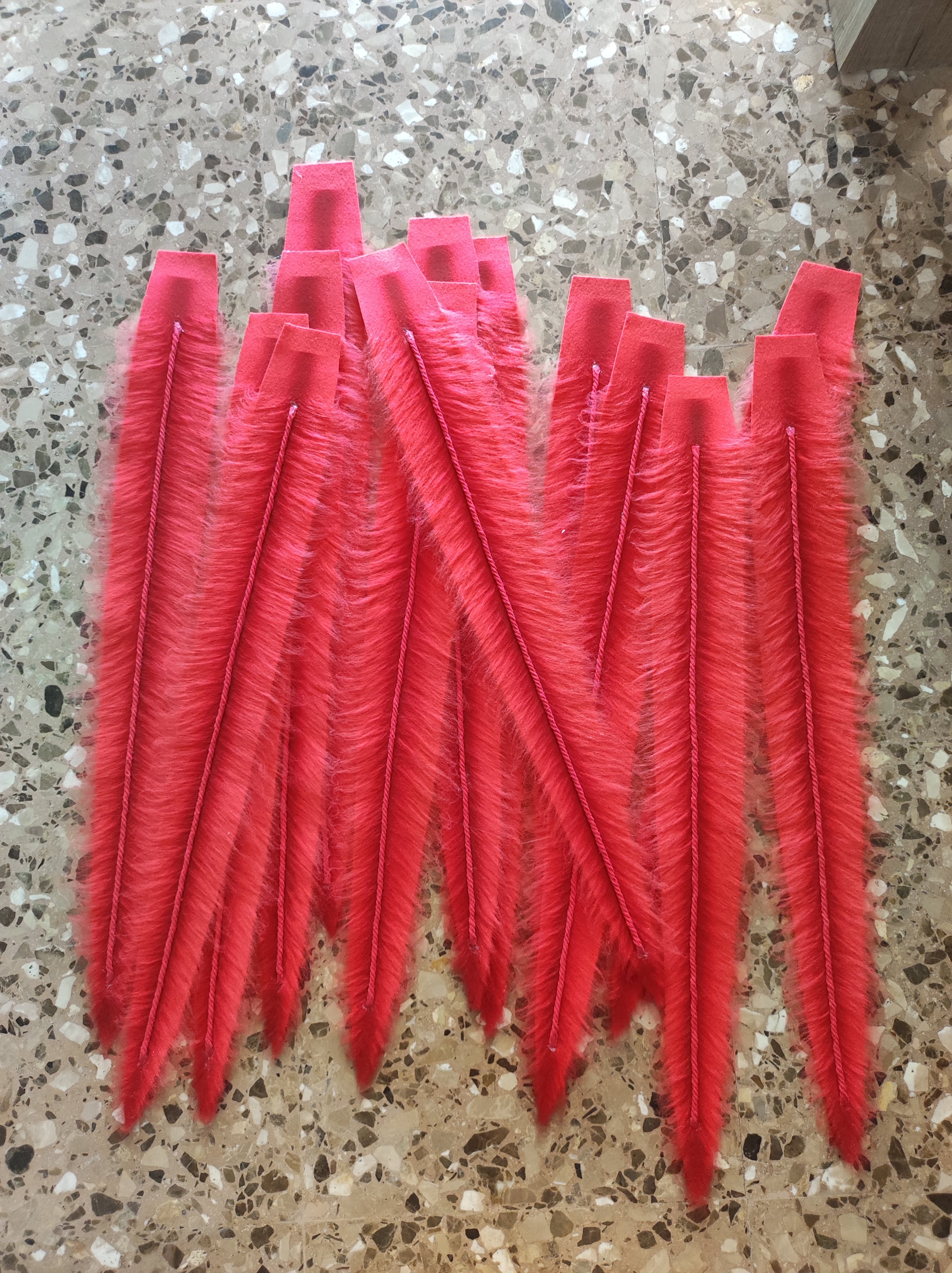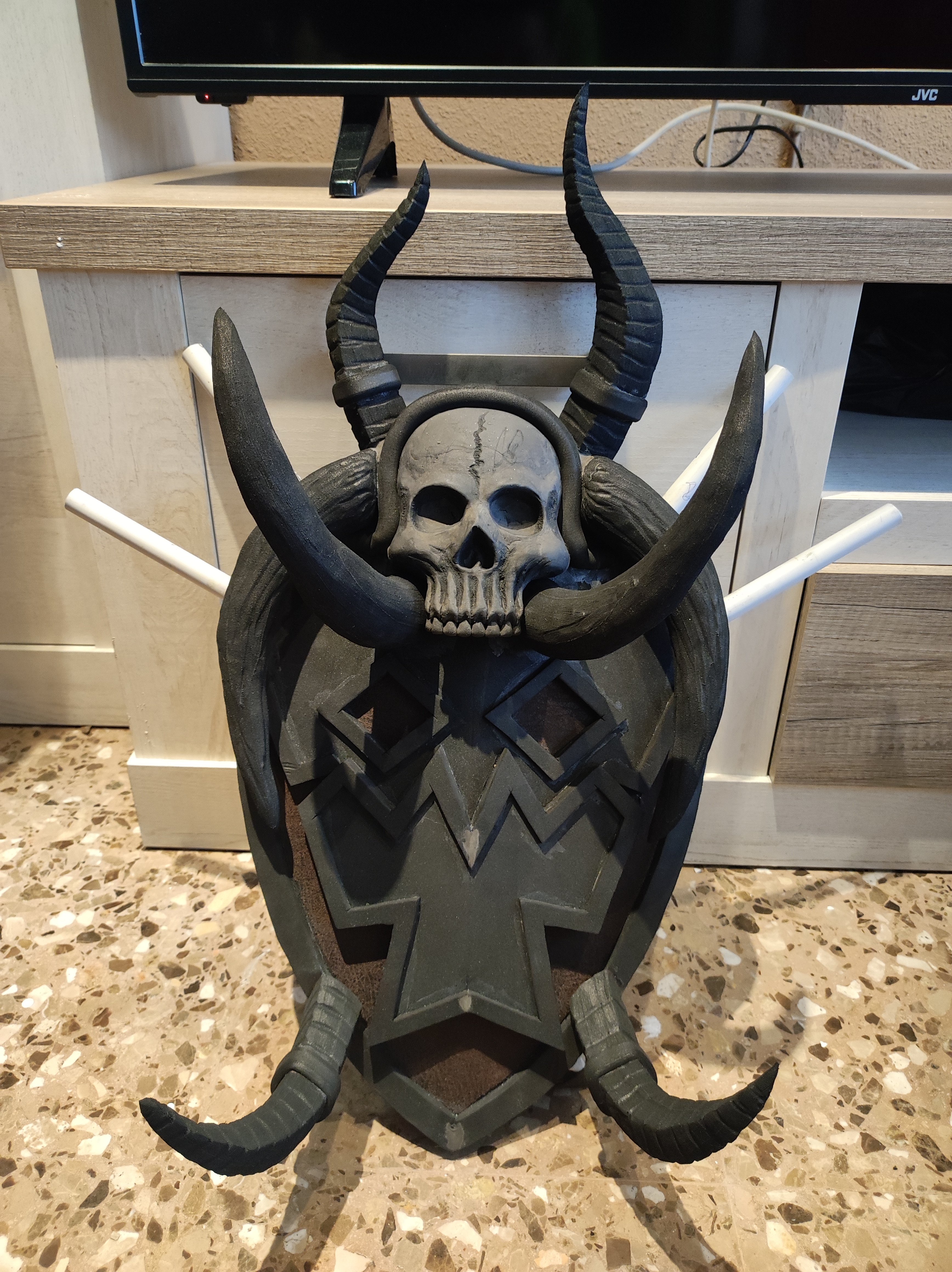 The skull is modeled with foam clay. The feathers on the head are made of EVA foam with wire inside. The base of the head, the horns, the skull, and all the other details are made of rubber. The skull on the necklace is modeled with foam clay.