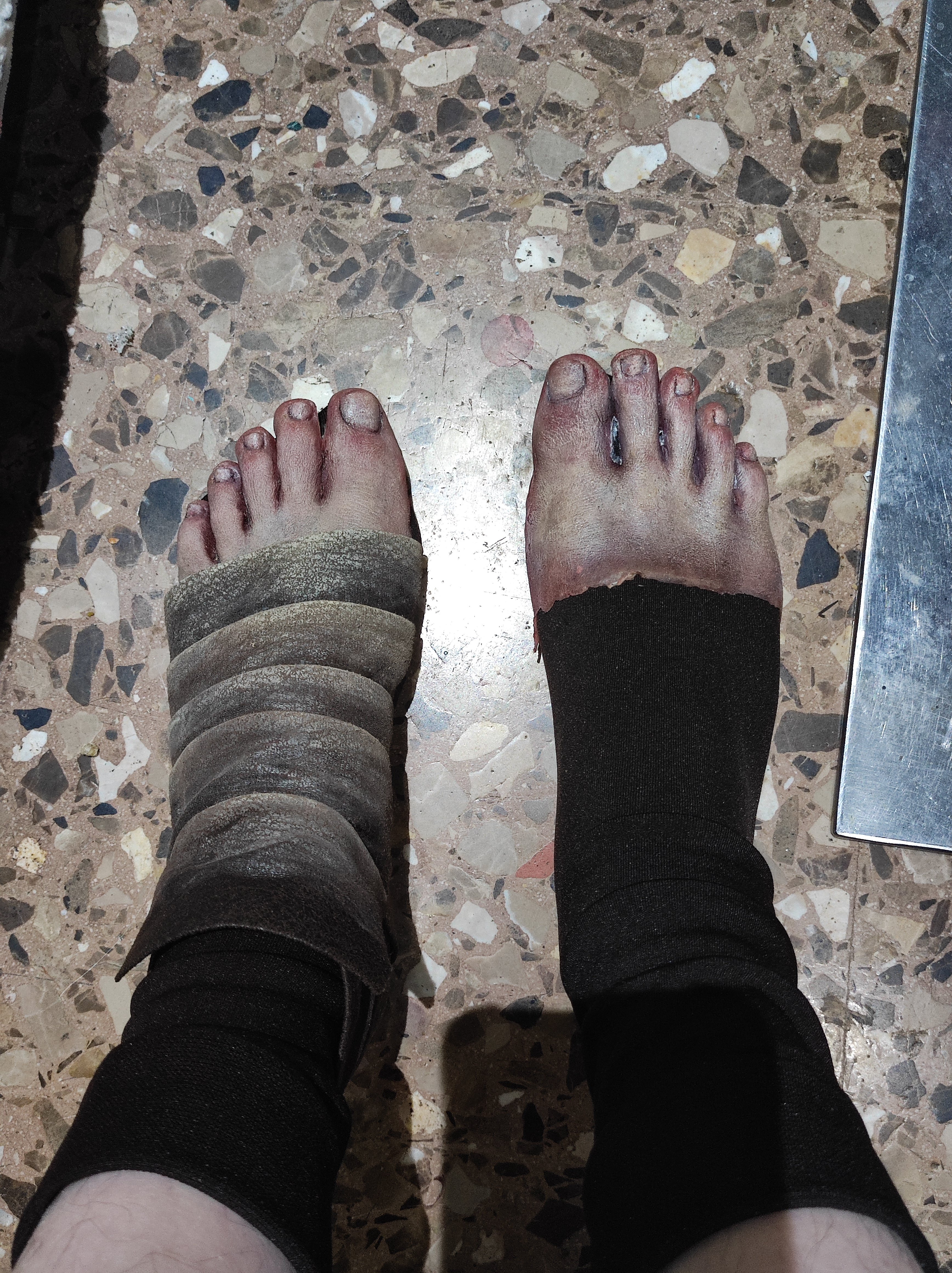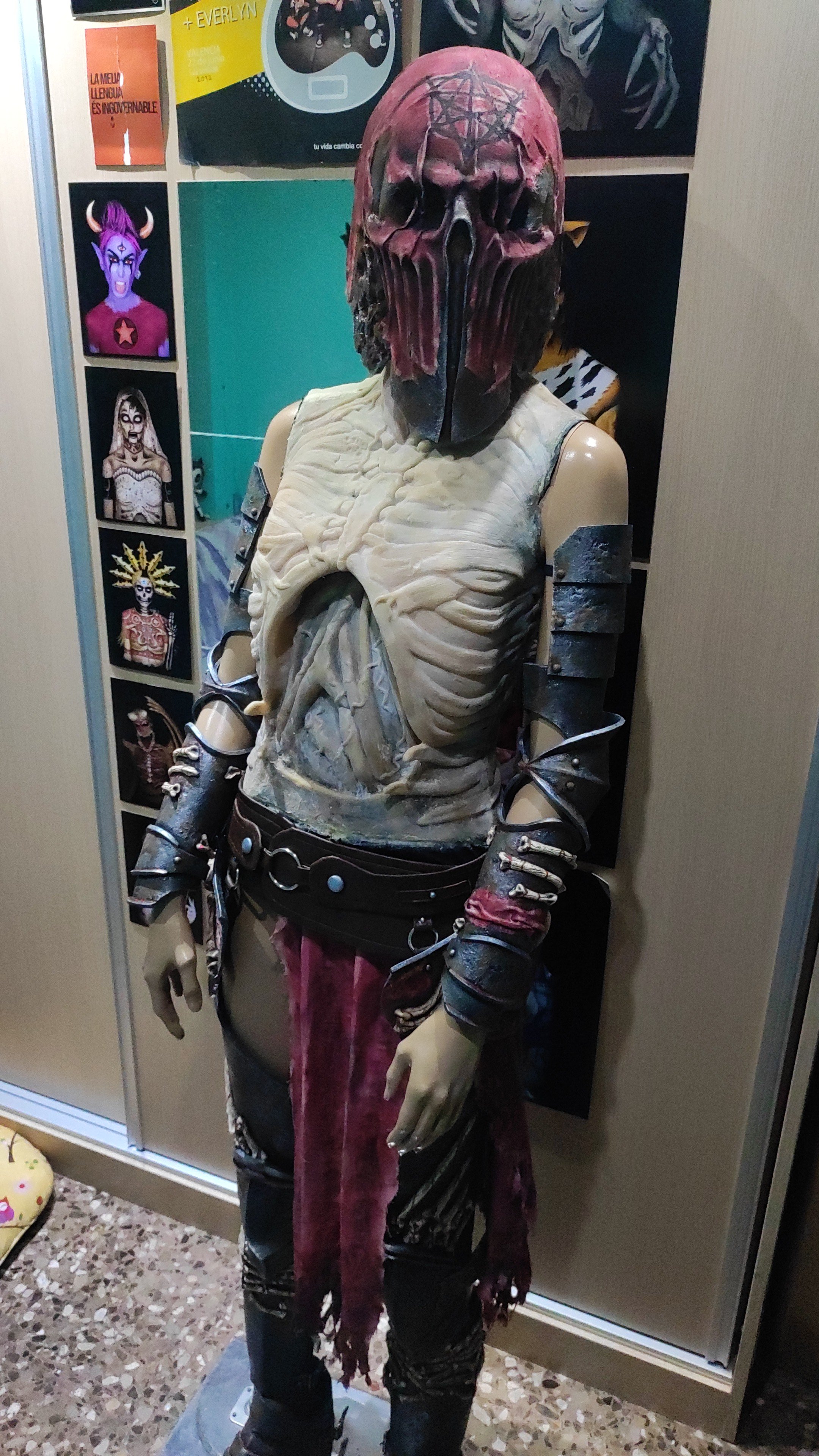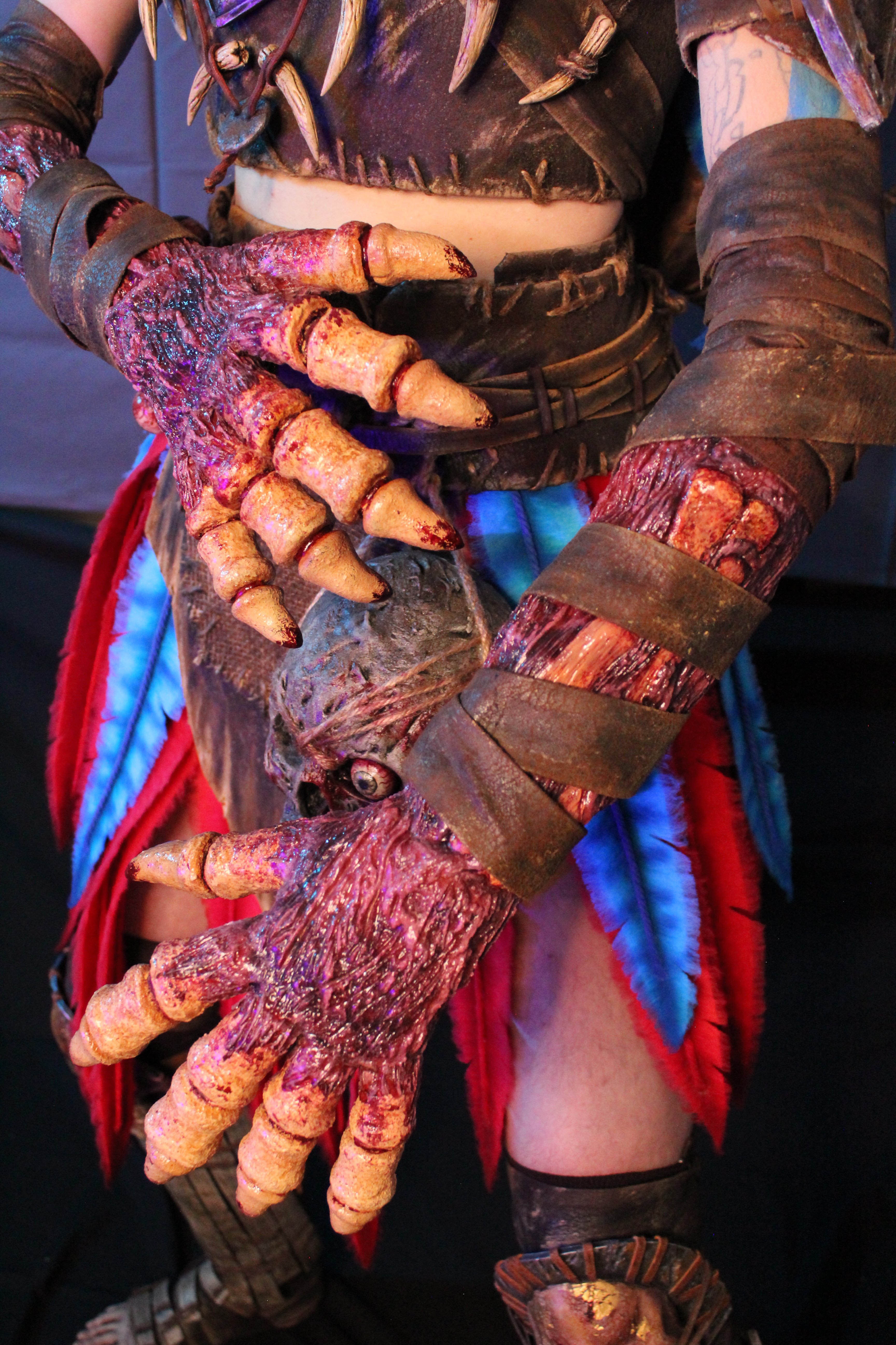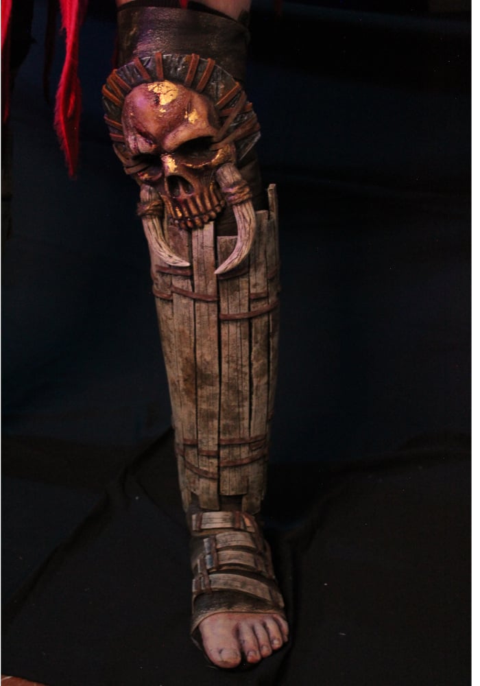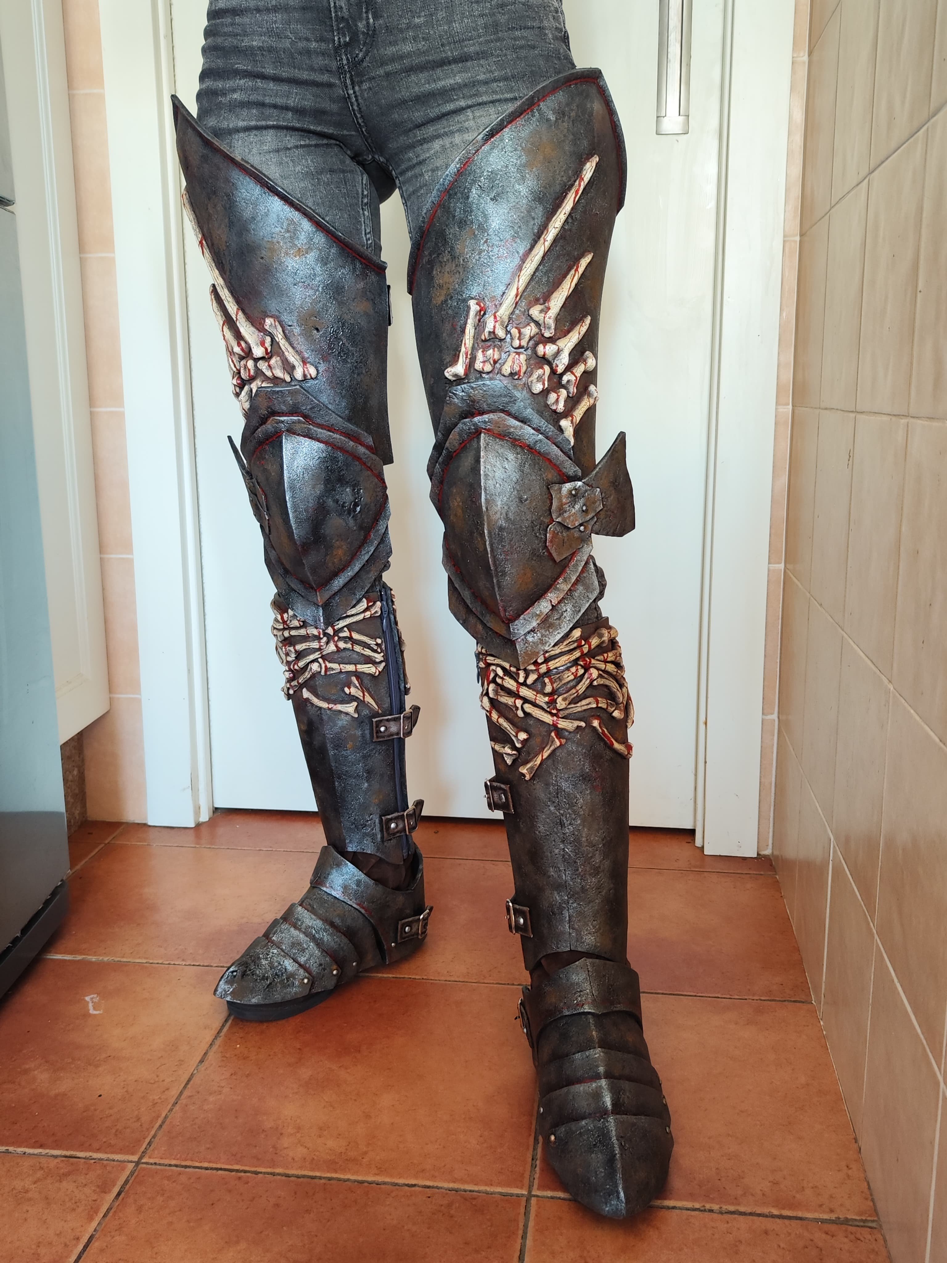 The skulls on the knees are also made of latex, previously modeled with monster clay. The armor on the legs and feet is made of EVA foam, and the toes are made of latex glued to a sock.