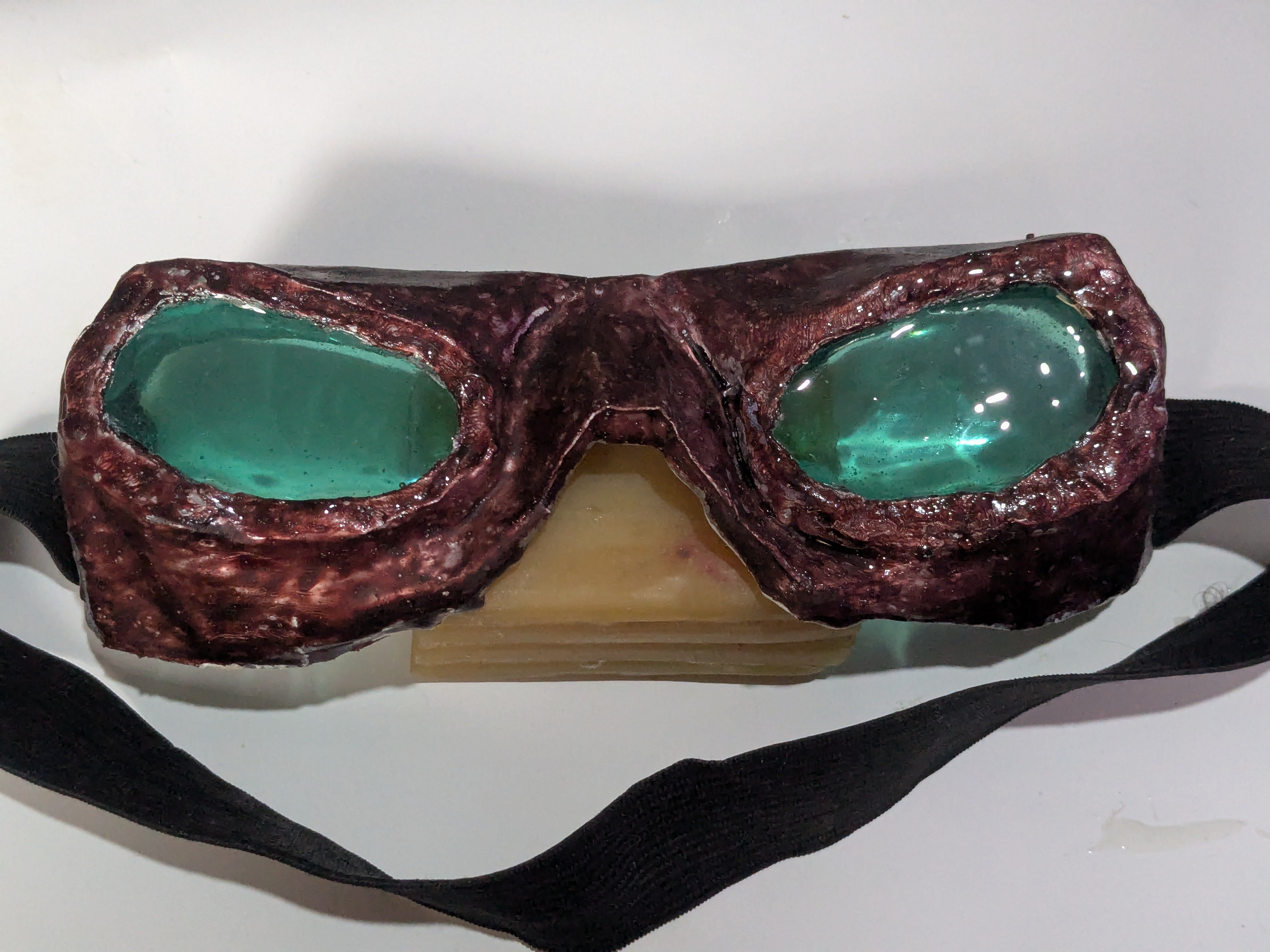 The pilot goggles were patterned in pepakura and built with layers of masking tape sandwiched between even more layers of PVA. The appropriate lenses were attached and resin poured on them.