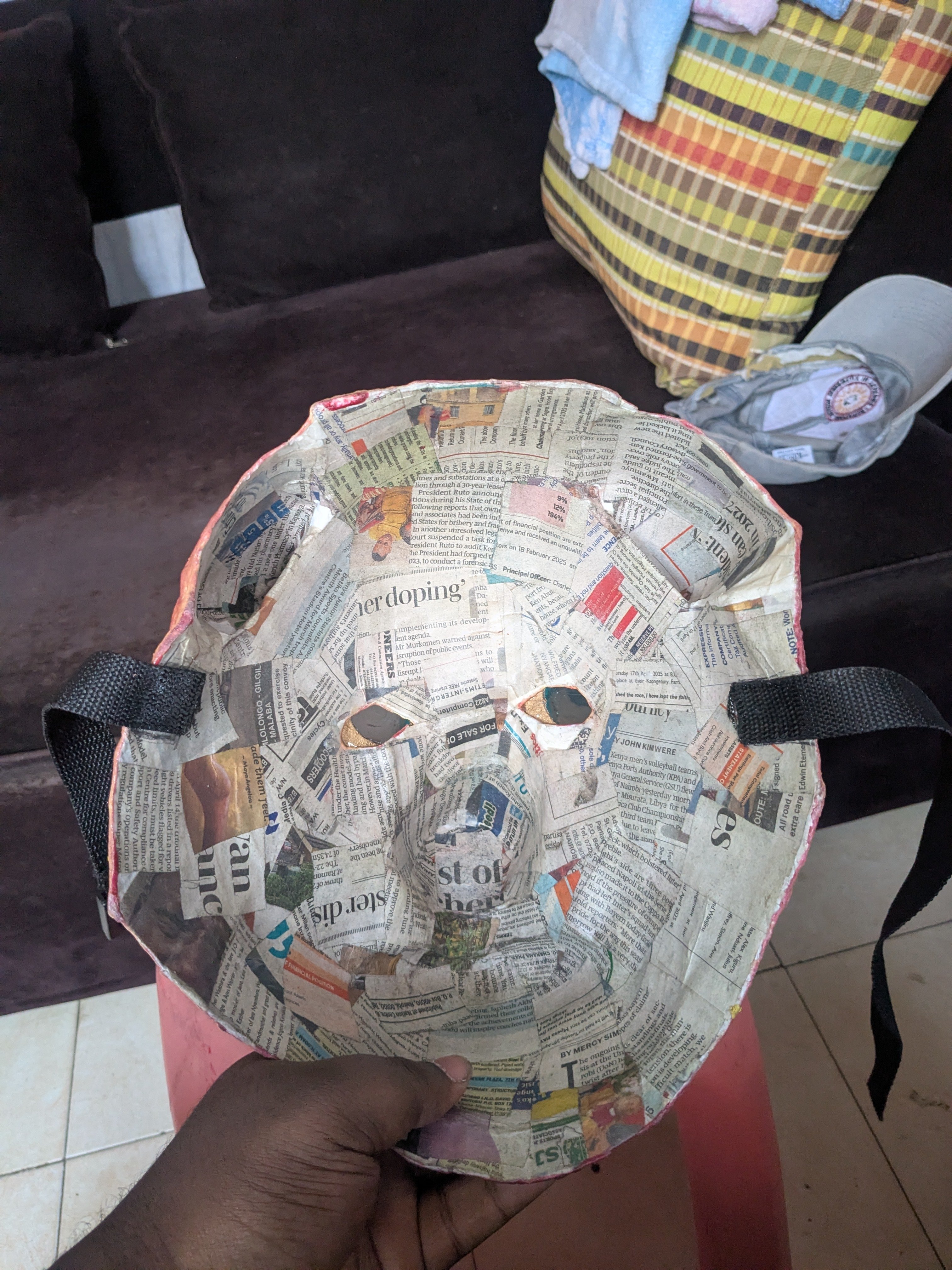 The 3D model parts were unfolded in pepakura designer and built with paper. Once put together, layers of papier mache were done to strengthen the mask. Using a mix of PVA glue and cotton wool, sculpting was done to make all features accurate to the character and get a realistic fleshy texture.