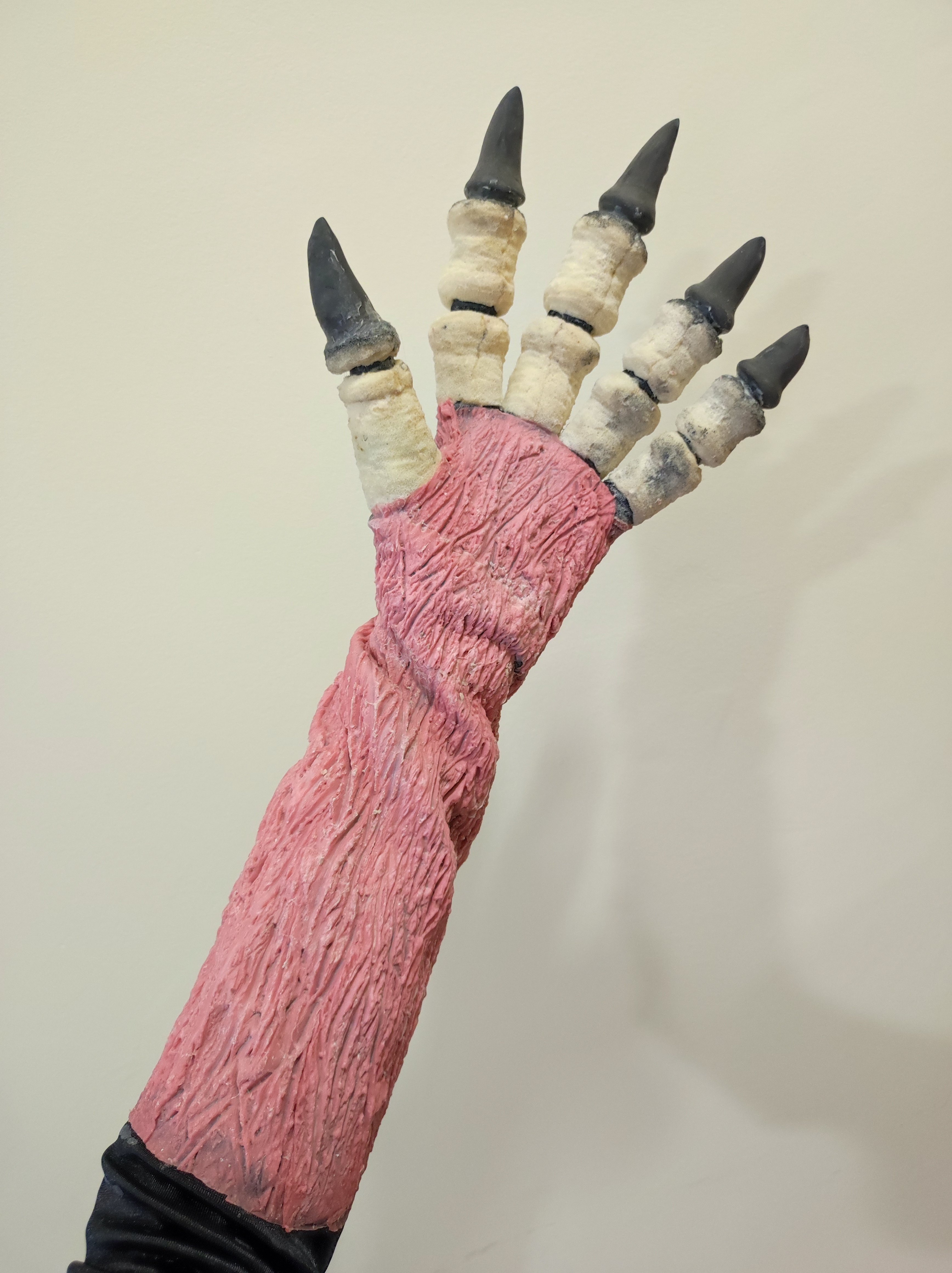 To make the arms, I first modeled torn skin texture with monster clay, made a mold, and transferred it to latex. Then I glued it to a glove. The fingers are made of sponge with latex.