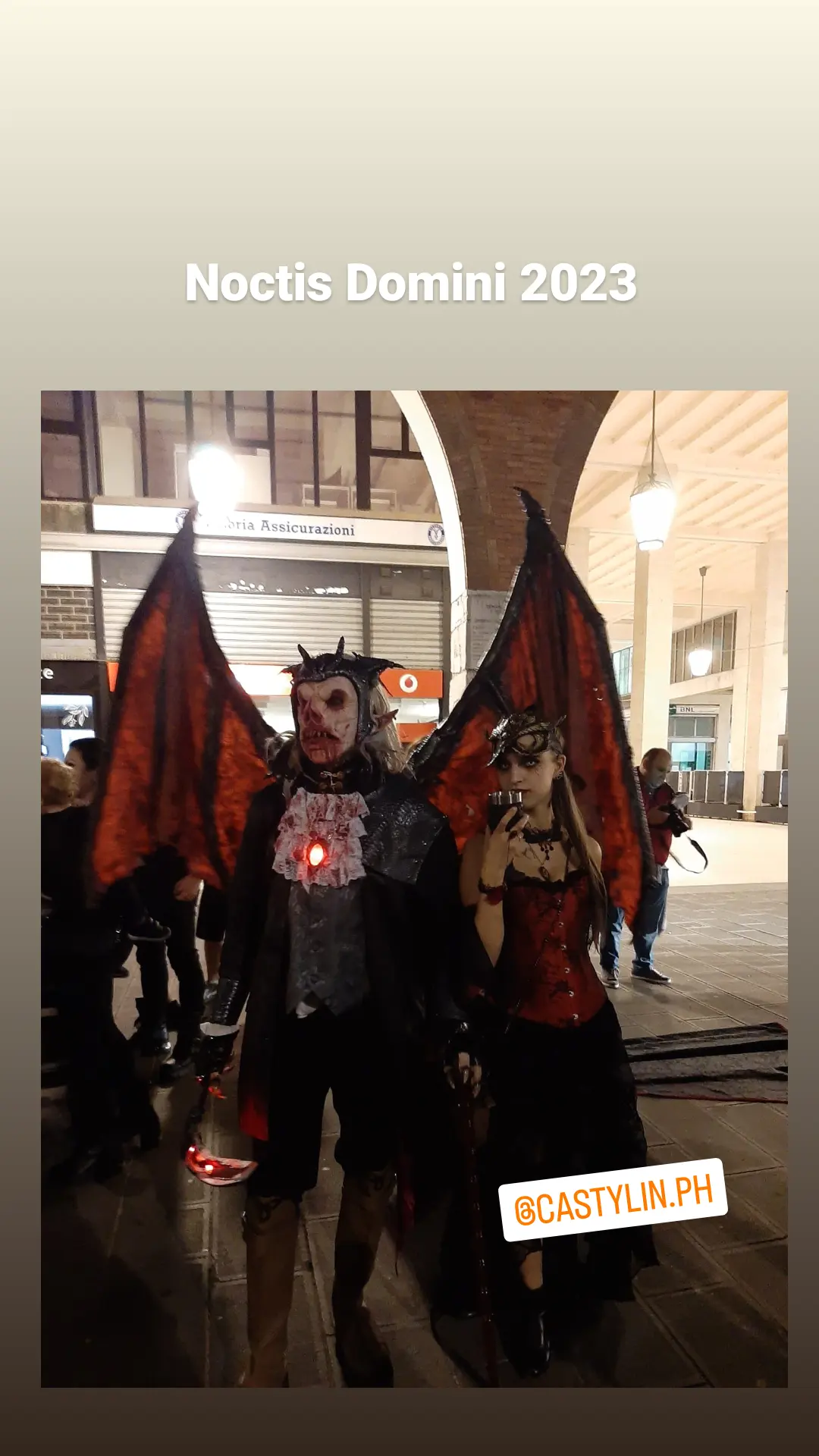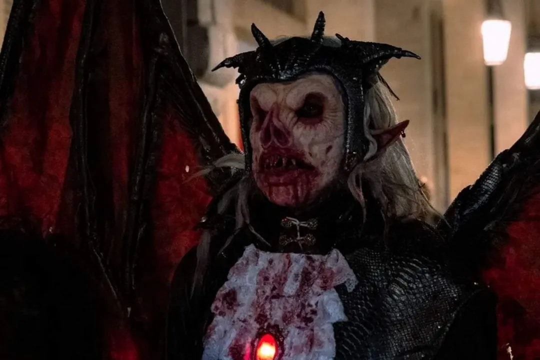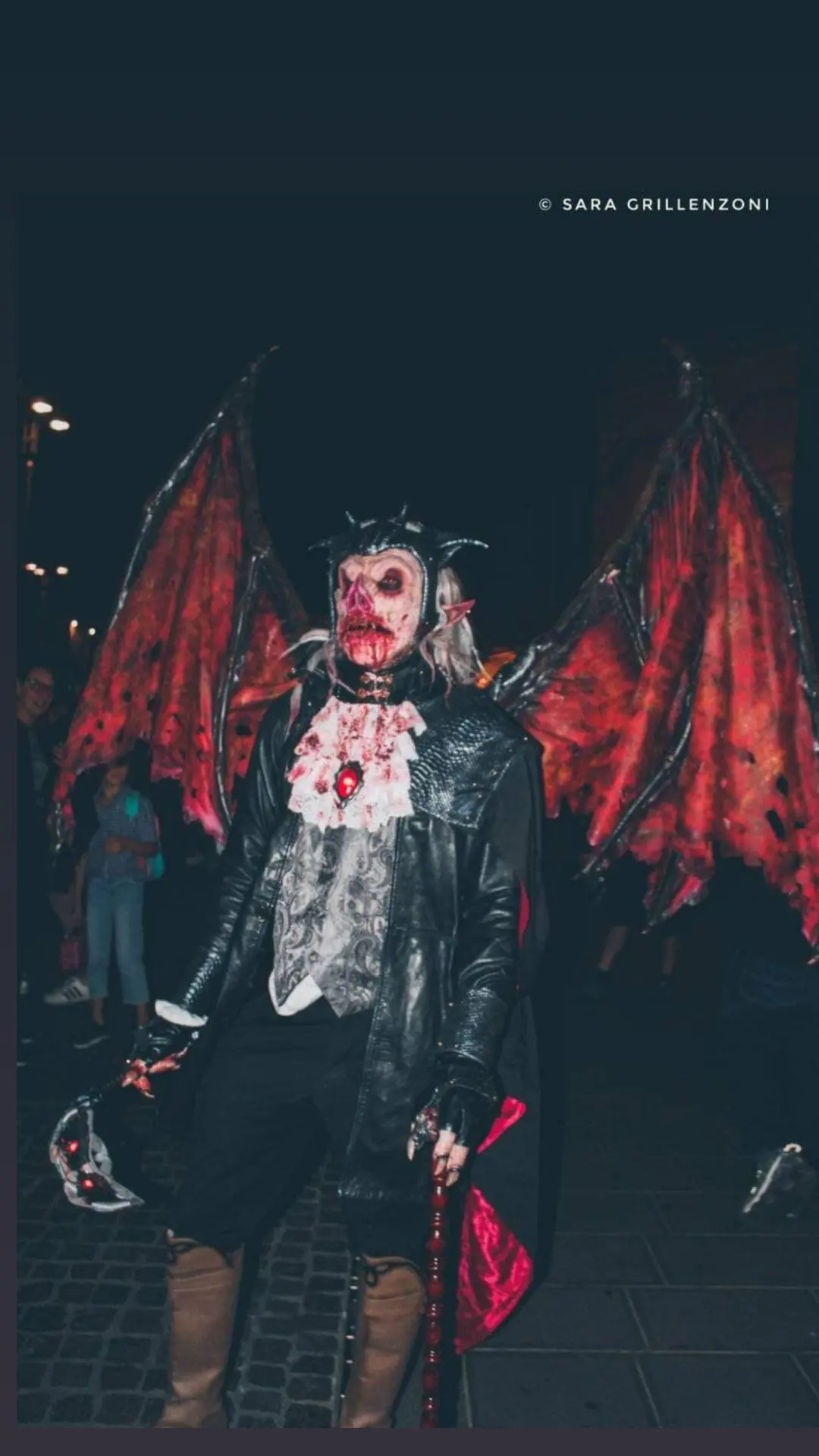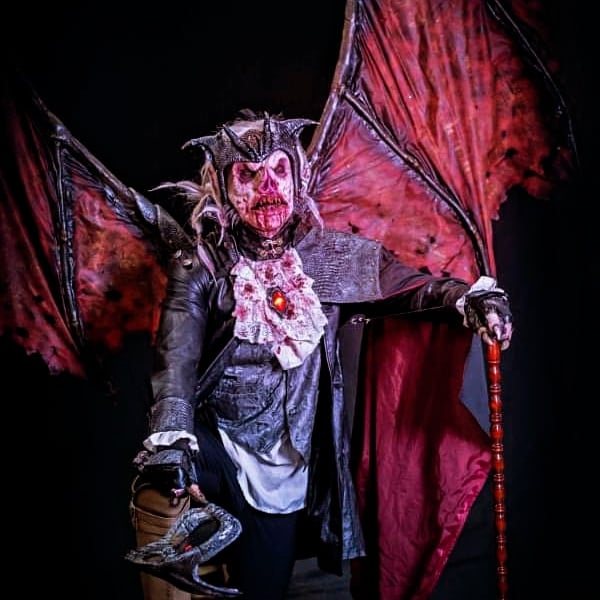 Old vampire costume, silicone mask with resin teeth, working mechanical bat-like wings. Latex casted hands. The outfit made in fake-leather/stamped leather.