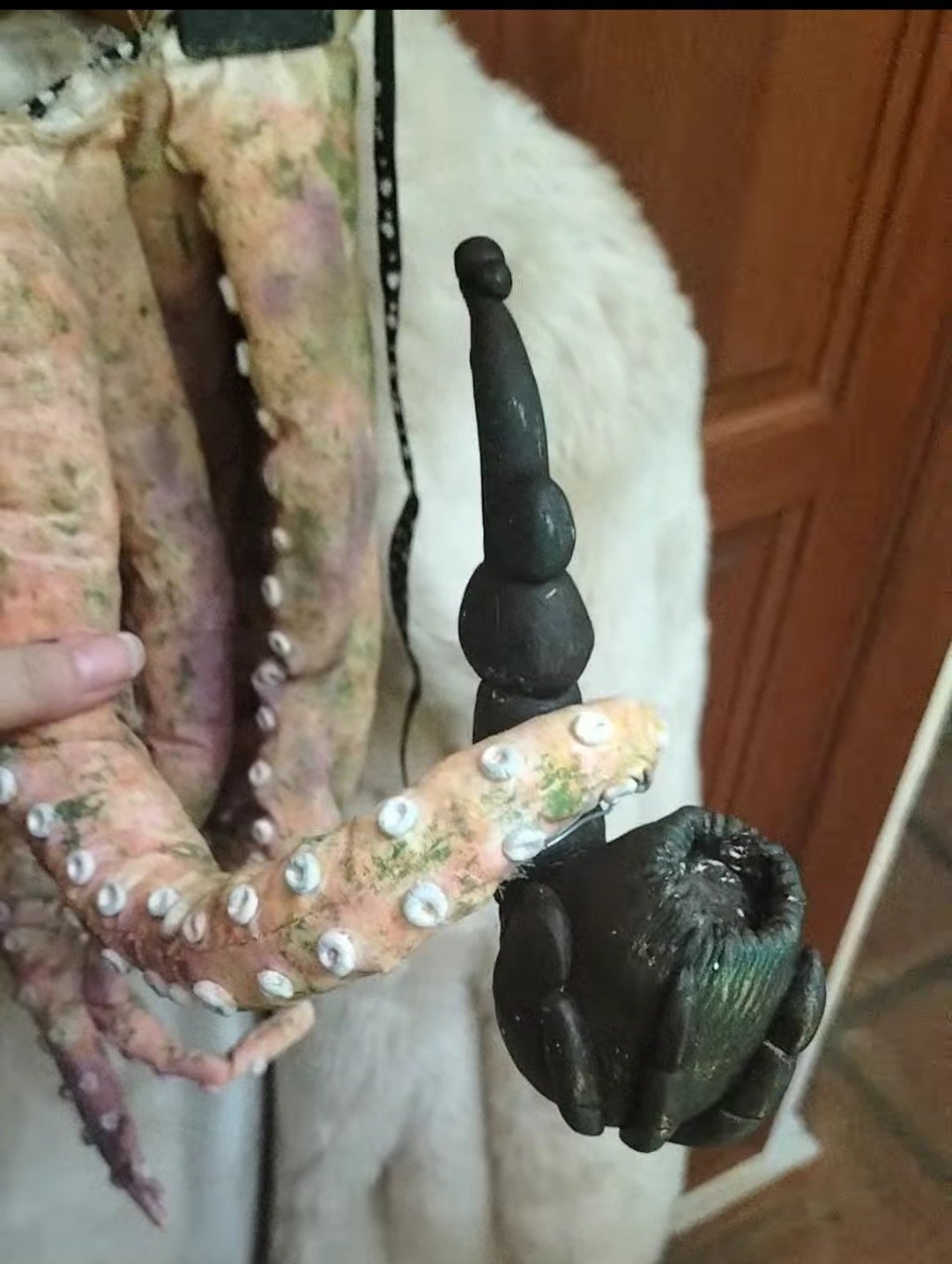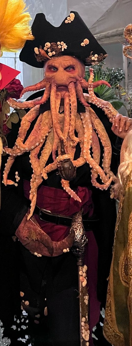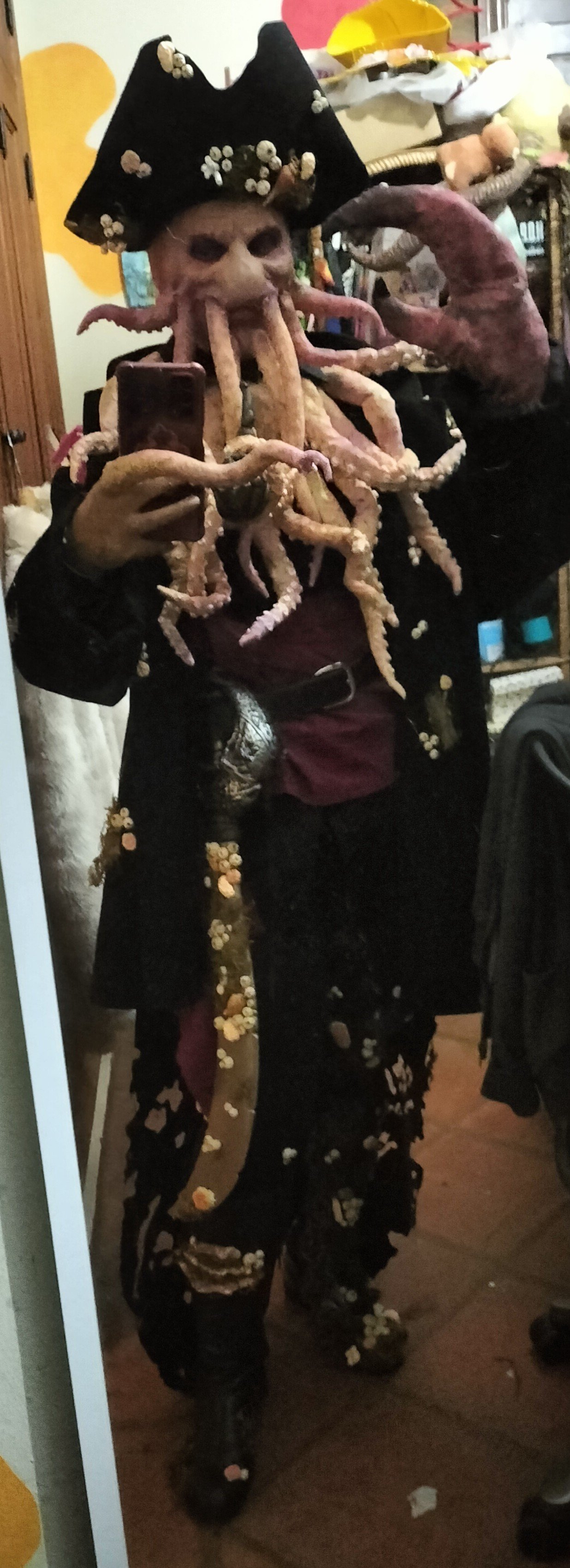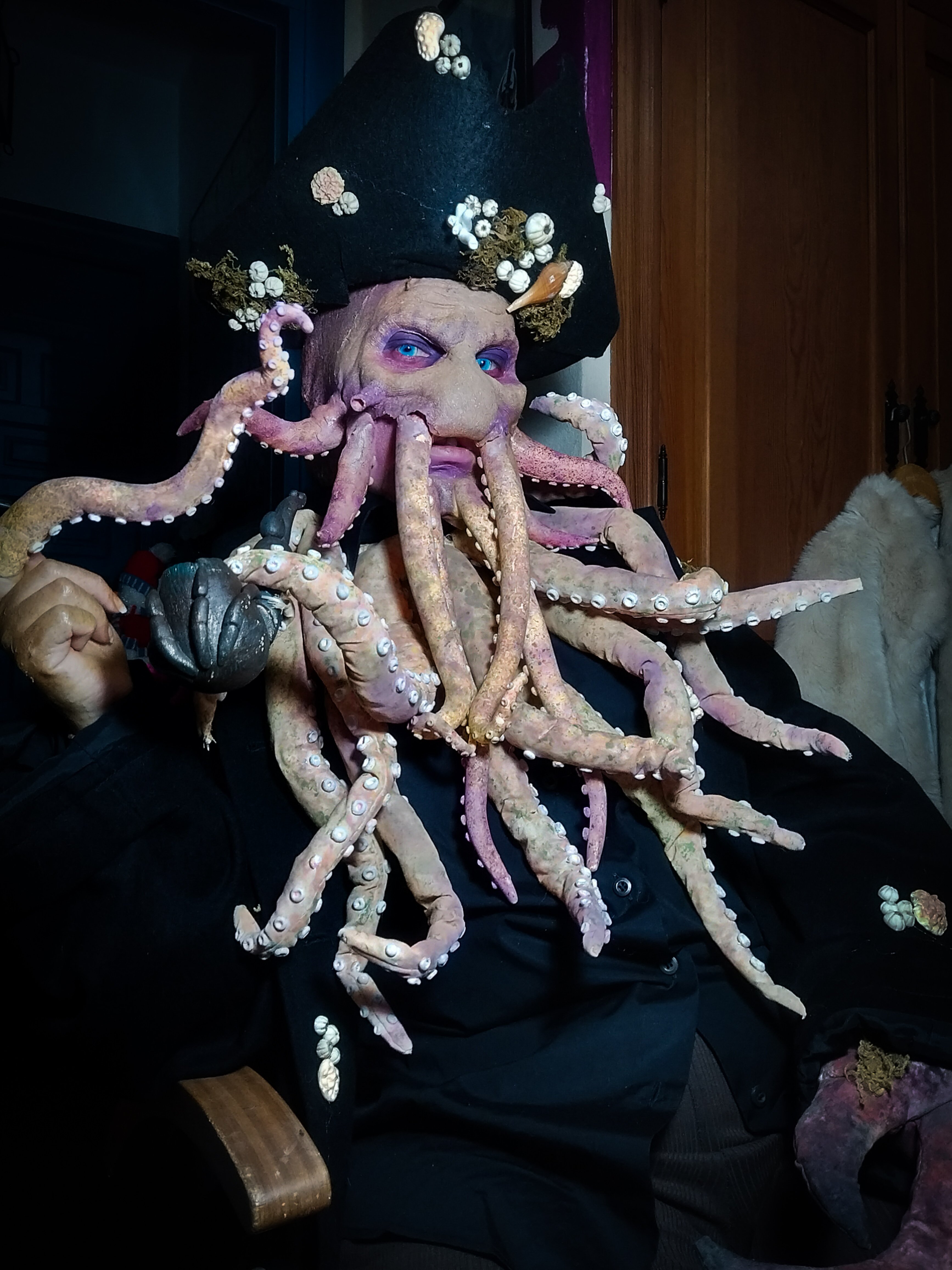Everything is handmade by me (except for the clothes, hat, and sword, which I just transformed). I sculpted the prosthetic with Monster Clay Medium, made the mold, and then created the facial tentacles with air-dry clay. For the rest, I used an old sheet and turned it into tentacles that could change shape! I hand-sewed them, painted and glued on the suckers, made the crab hand and painted it as well, along with the finger tentacle. I also added small marine details to the outfit. I customized the boots with these details and added latex to give it a more ghostly look. I also lengthened the coat and burned it slightly to create that old, worn-out look, even though it can’t really be seen in the photos.