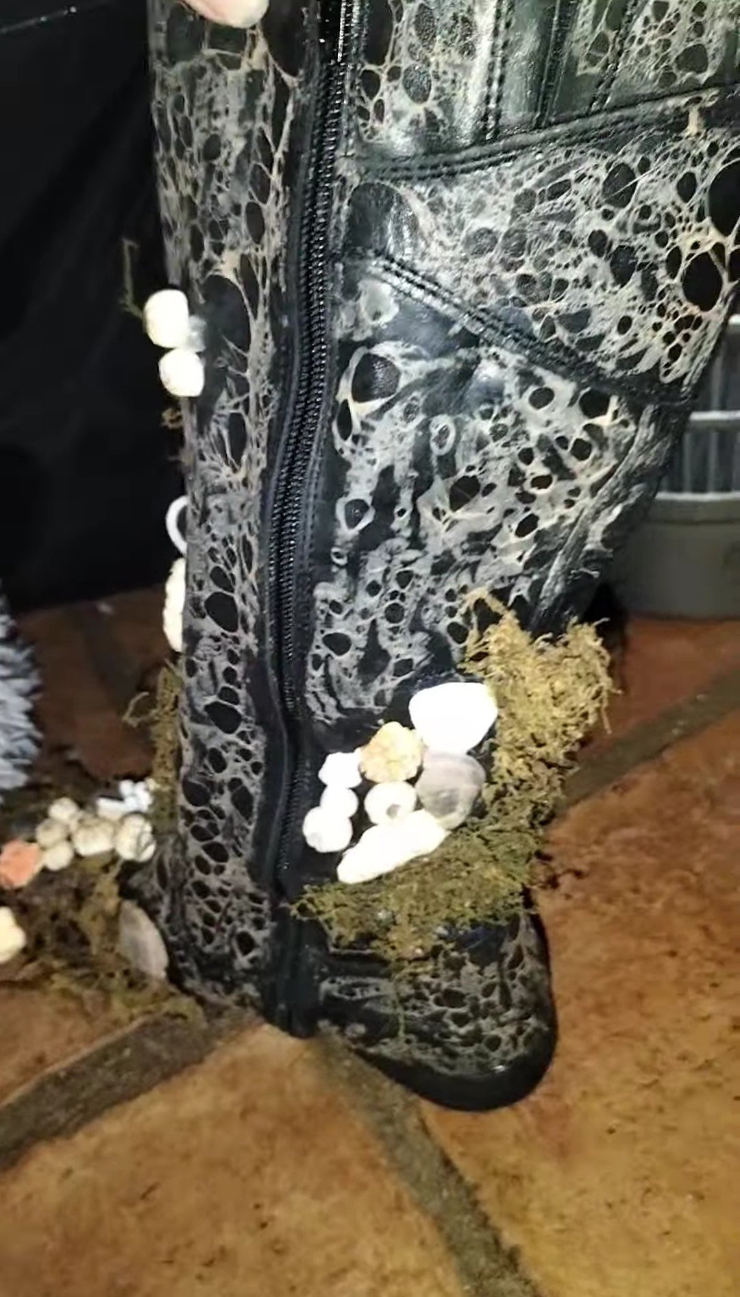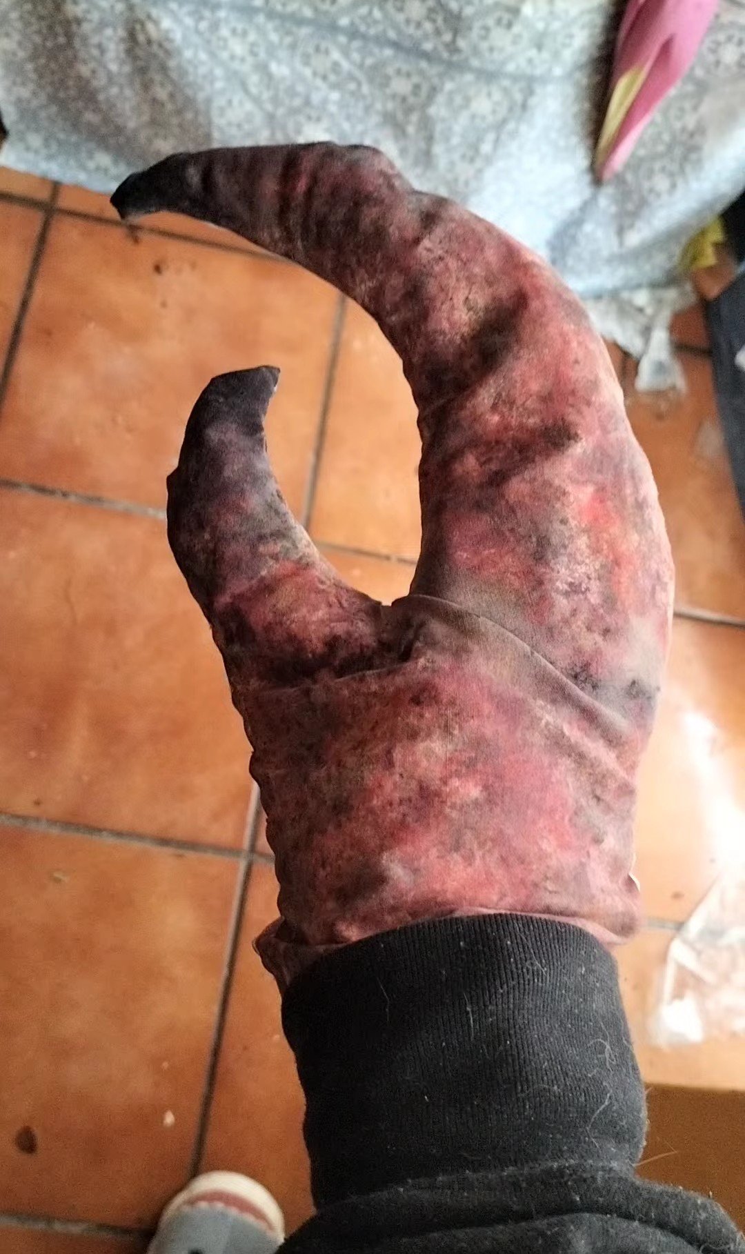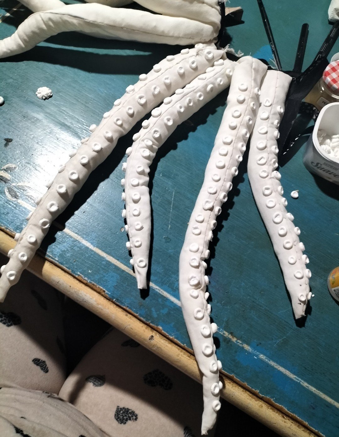 Everything is handmade by me (except for the clothes, hat, and sword, which I just transformed). I sculpted the prosthetic with Monster Clay Medium, made the mold, and then created the facial tentacles with air-dry clay. For the rest, I used an old sheet and turned it into tentacles that could change shape! I hand-sewed them, painted and glued on the suckers, made the crab hand and painted it as well, along with the finger tentacle. I also added small marine details to the outfit. I customized the boots with these details and added latex to give it a more ghostly look. I also lengthened the coat and burned it slightly to create that old, worn-out look, even though it can’t really be seen in the photos.