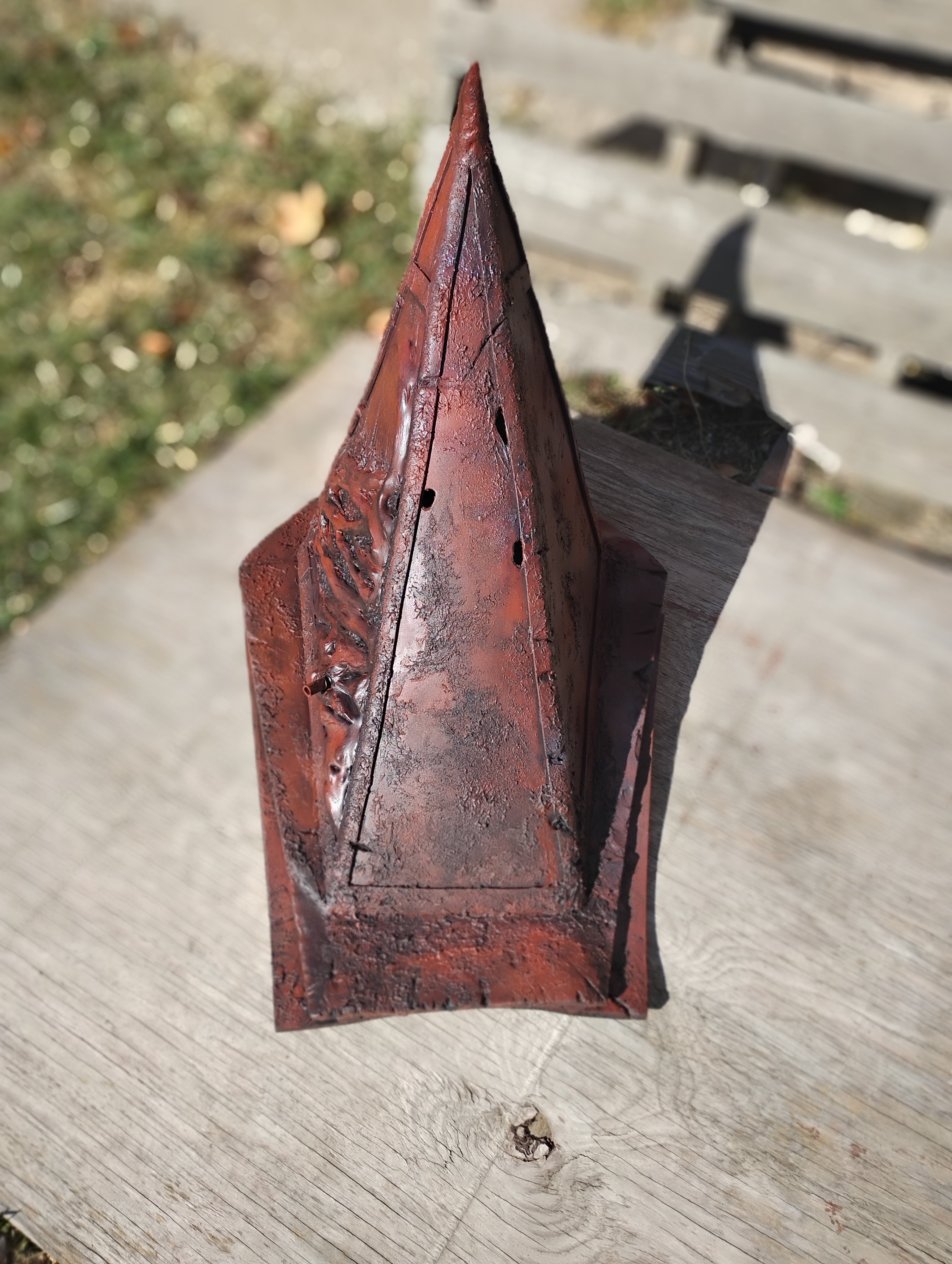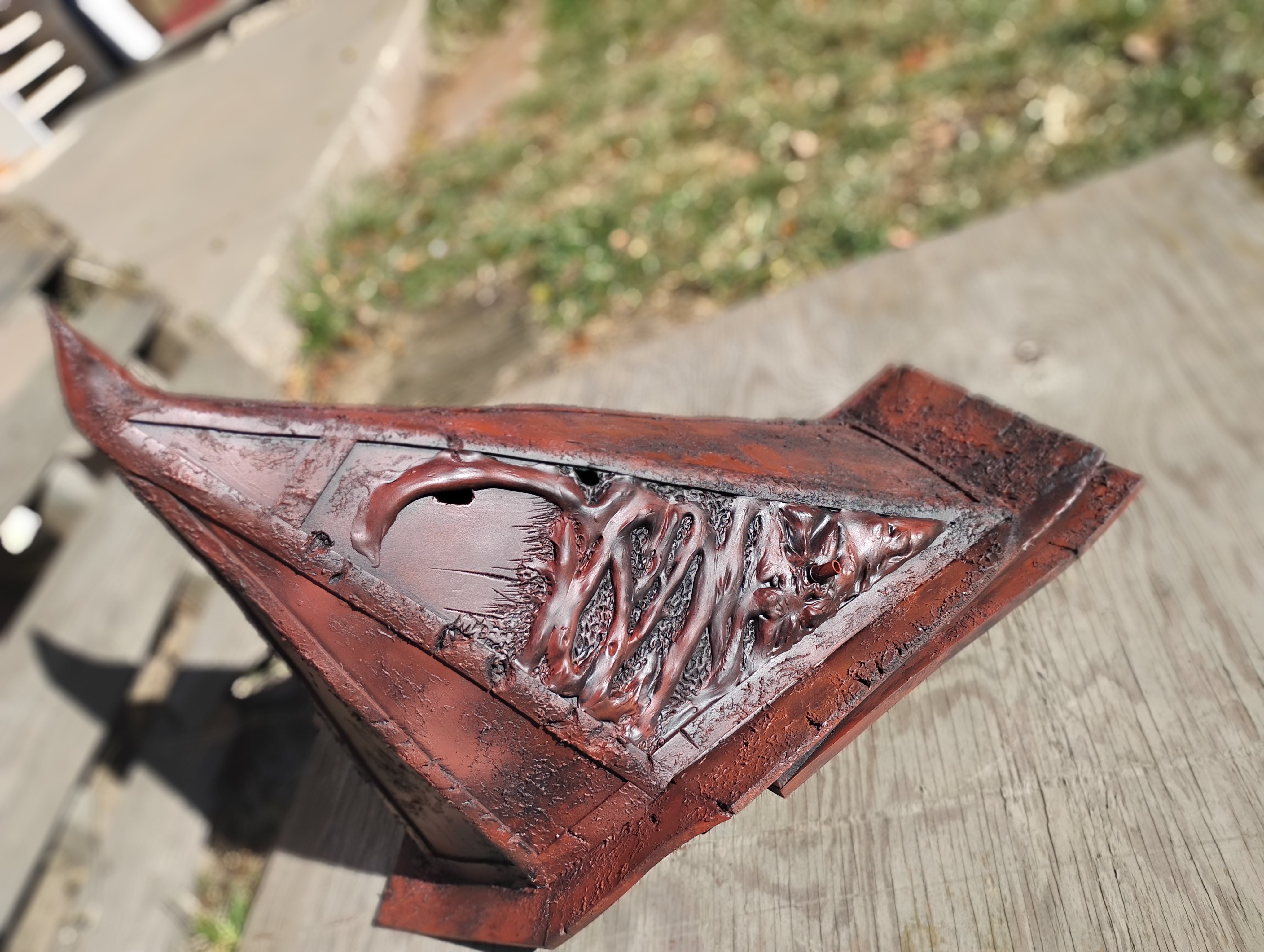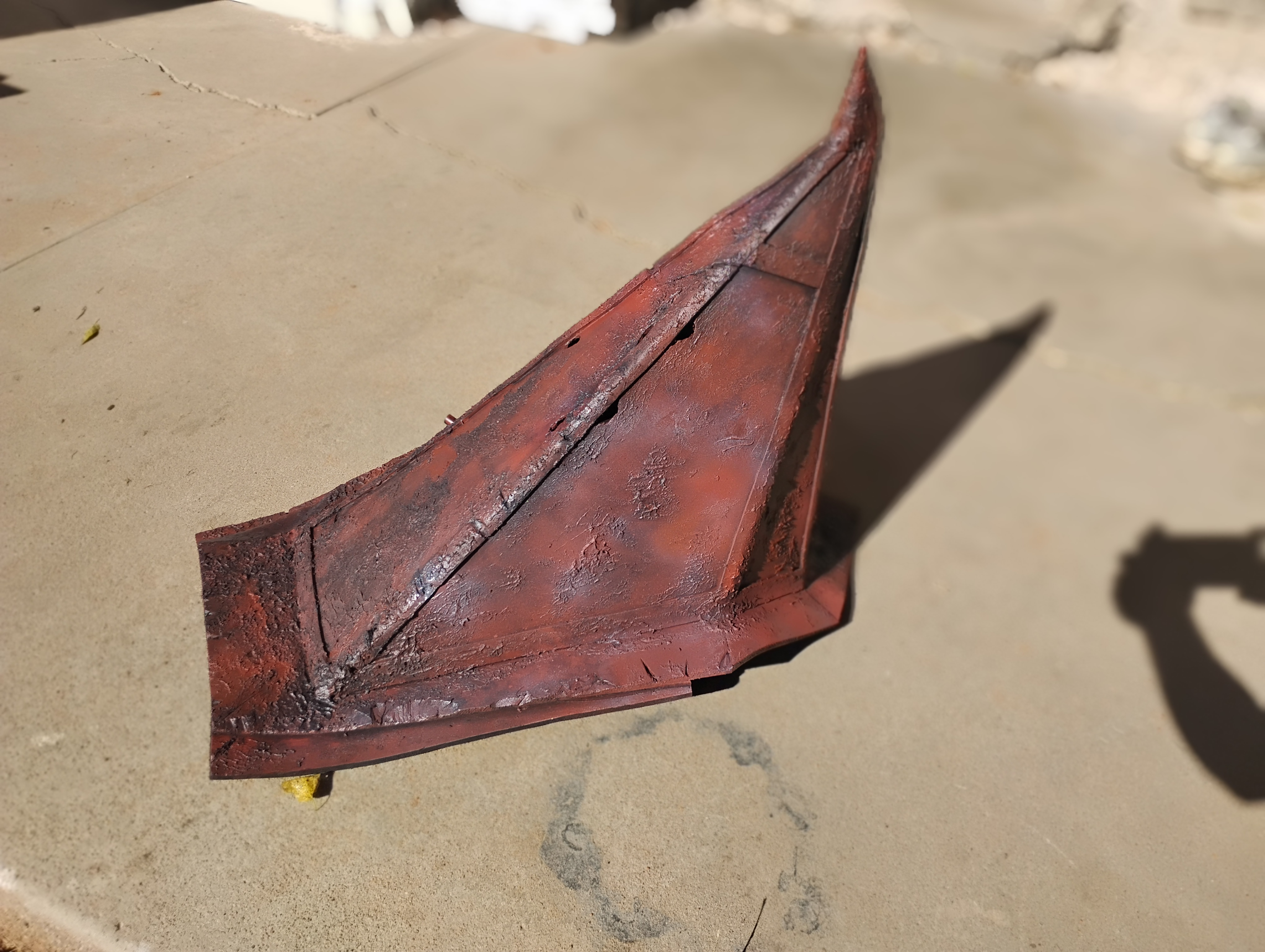 Done in just a few weeks, I grabbed a template and used one for the first time and crafted the head piece, carefully using a grainy acrylic medium to get that nasty rust look and hand painting for HOU