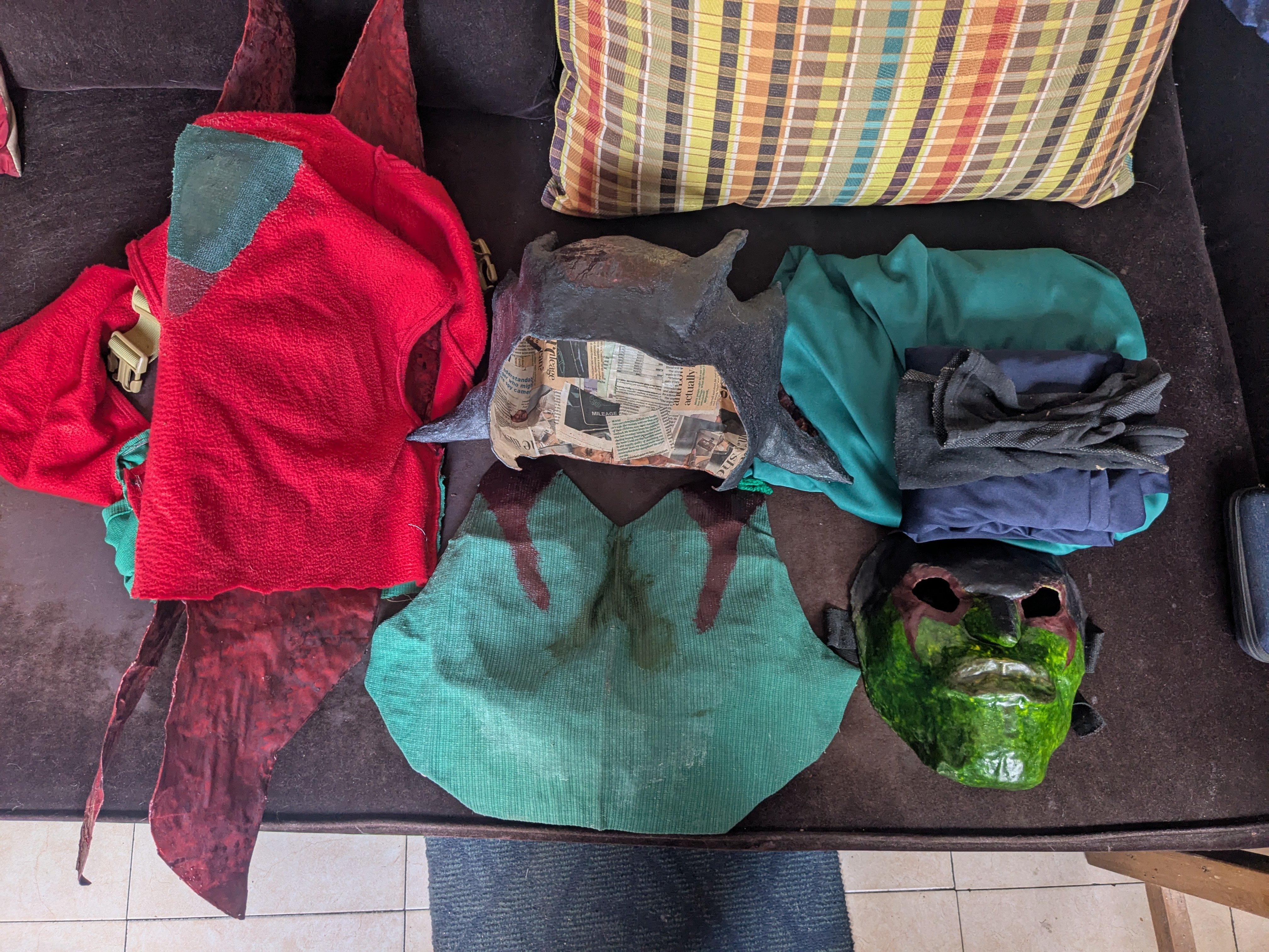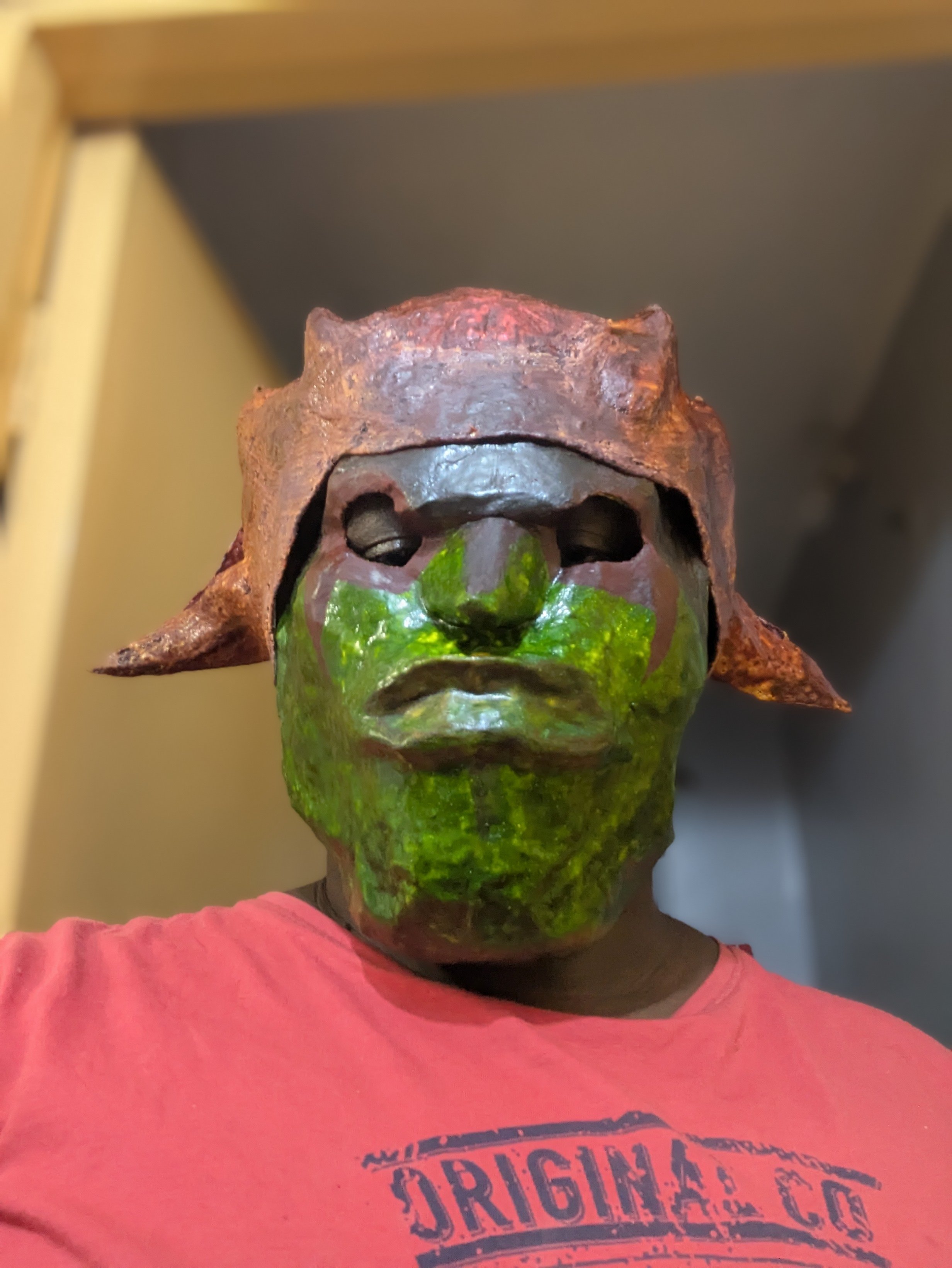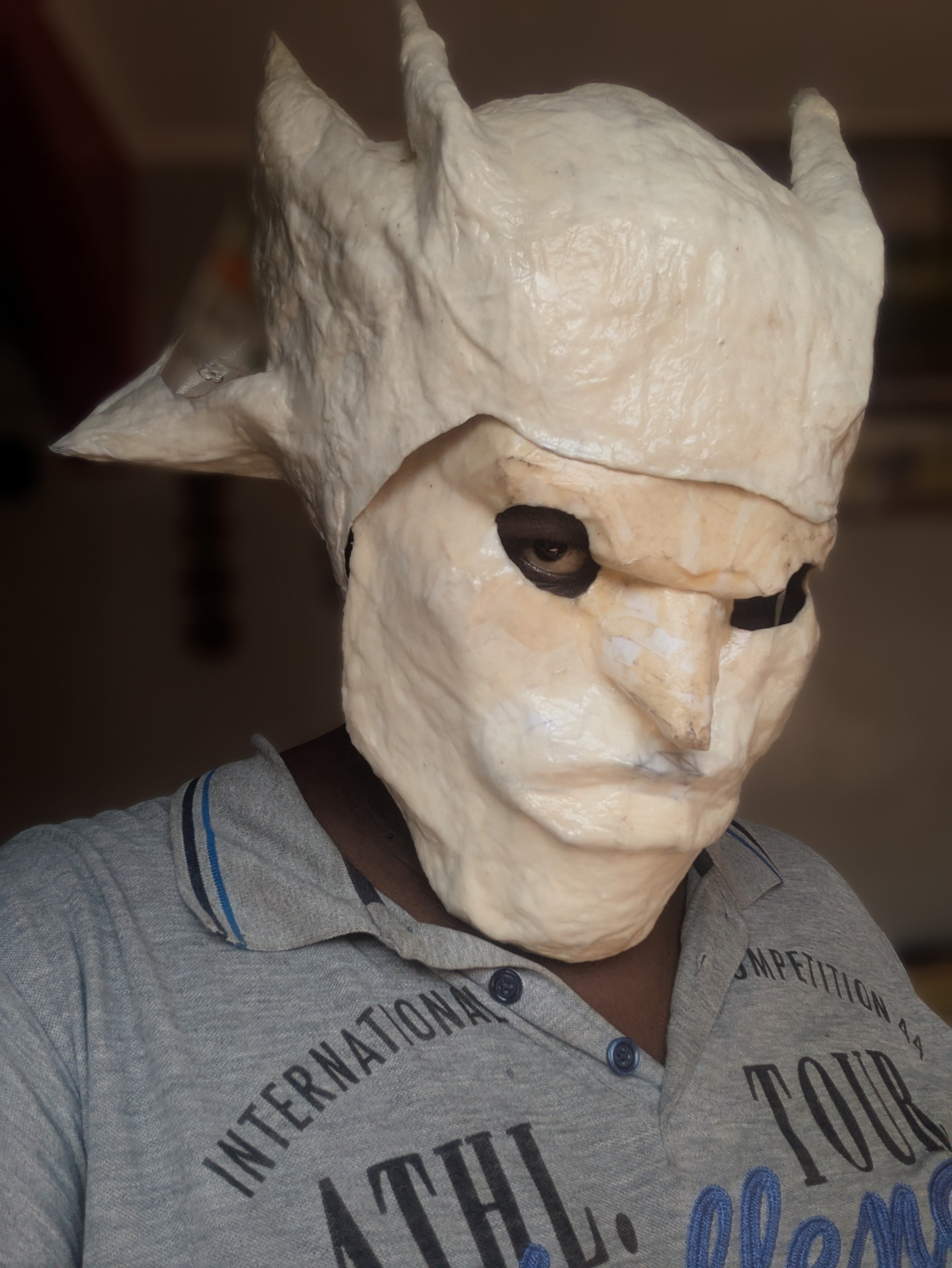 All the features were consolidated and the mask made to resemble the character through sculpting using a mix of cotton wool and PVA glue. The mask was then painted with several layers of paint made by mixing food coloring with glue in order to get the feel of skin layering