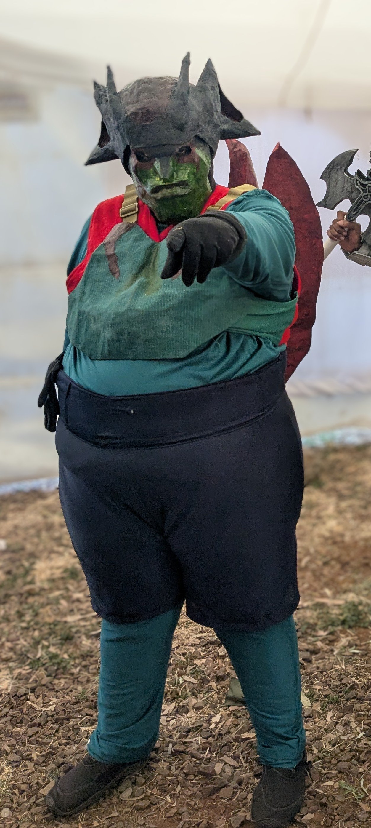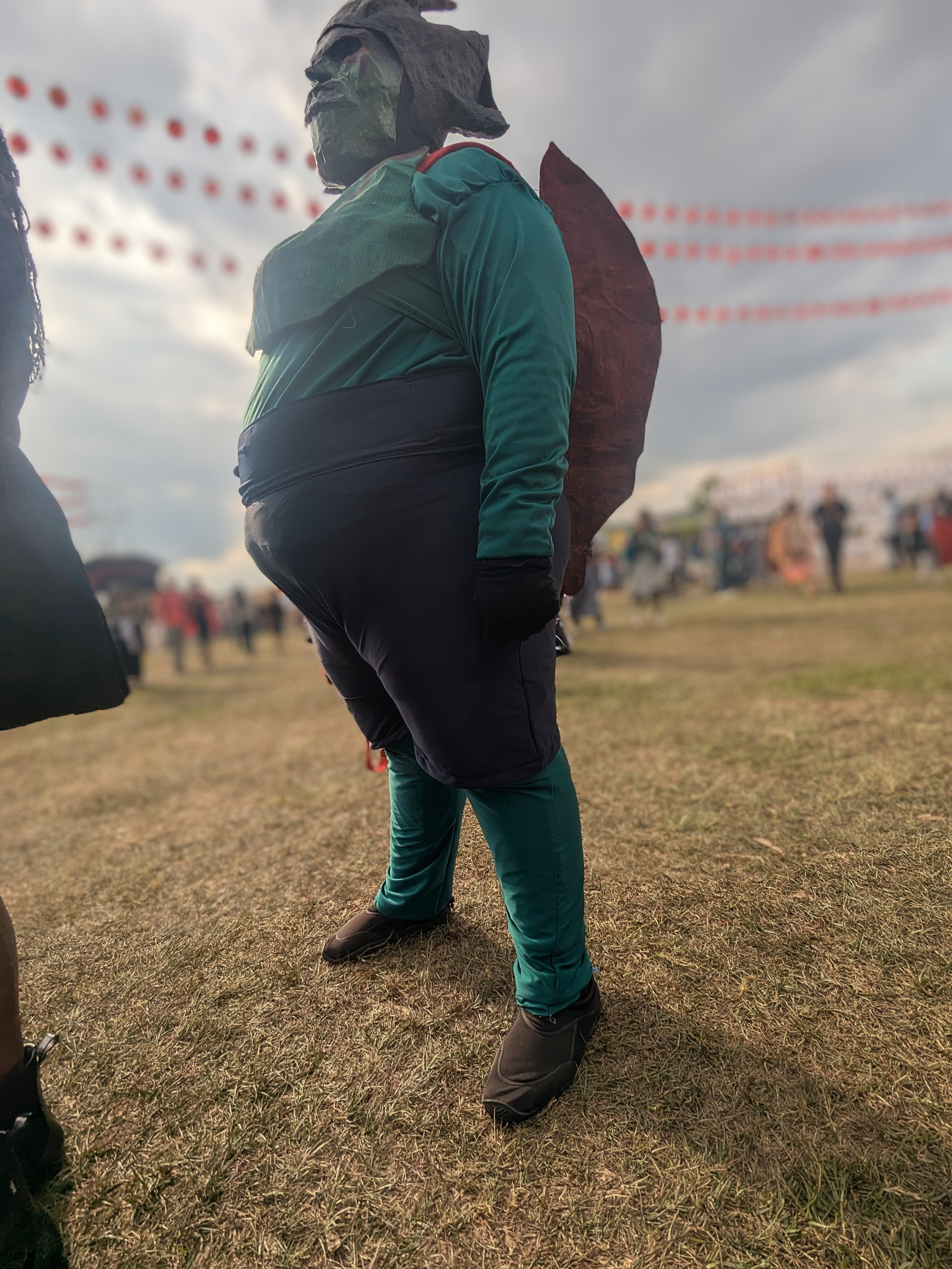 This cosplay is built primarily using paper for the hard pieces(mask, headpiece, breastplate, wings) and fabric for the rest.