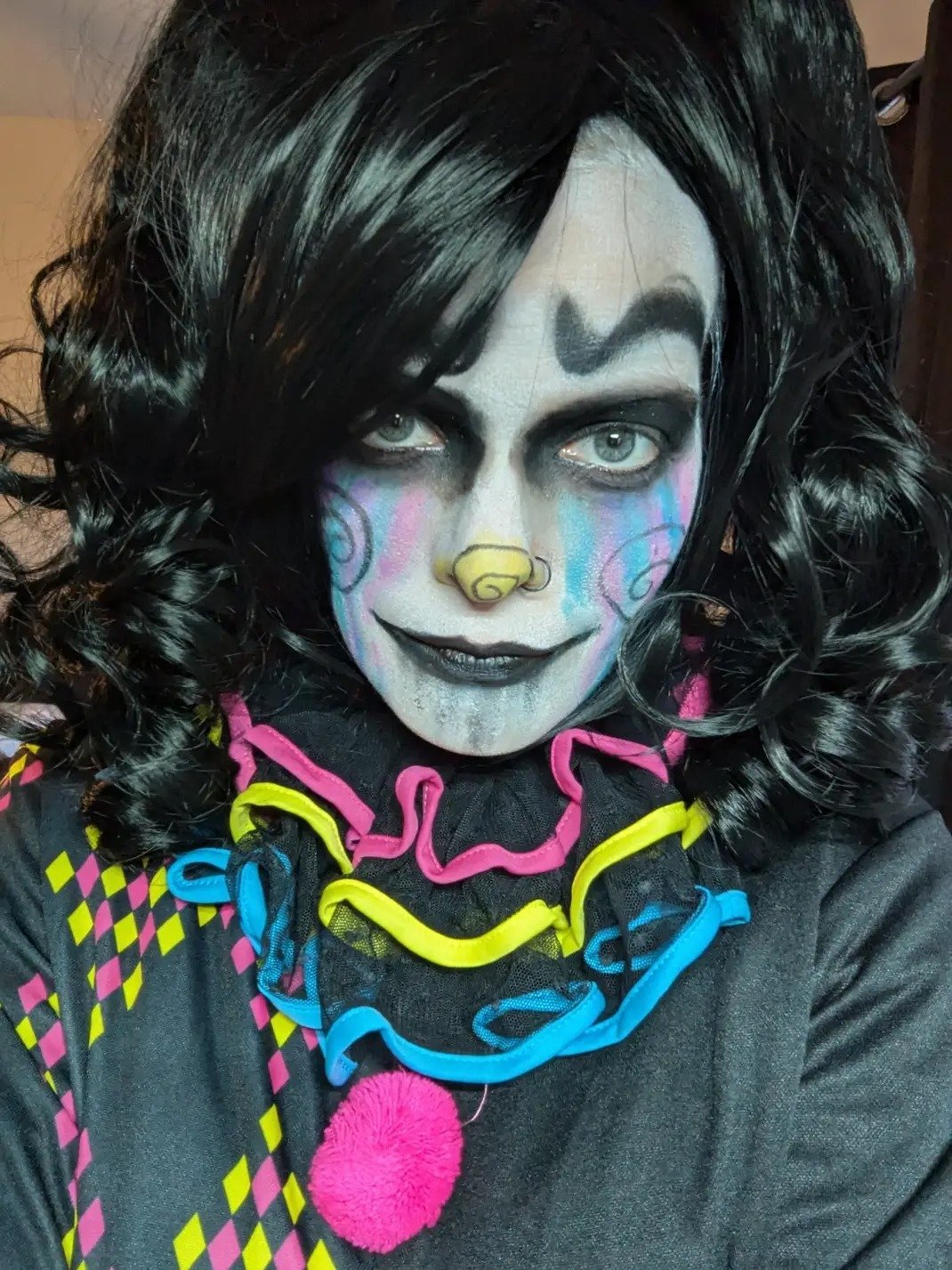 This is my completely original character, Zoomy the Clown. I thrifted a clown suit and based my makeup and wig around the colors of the suit.