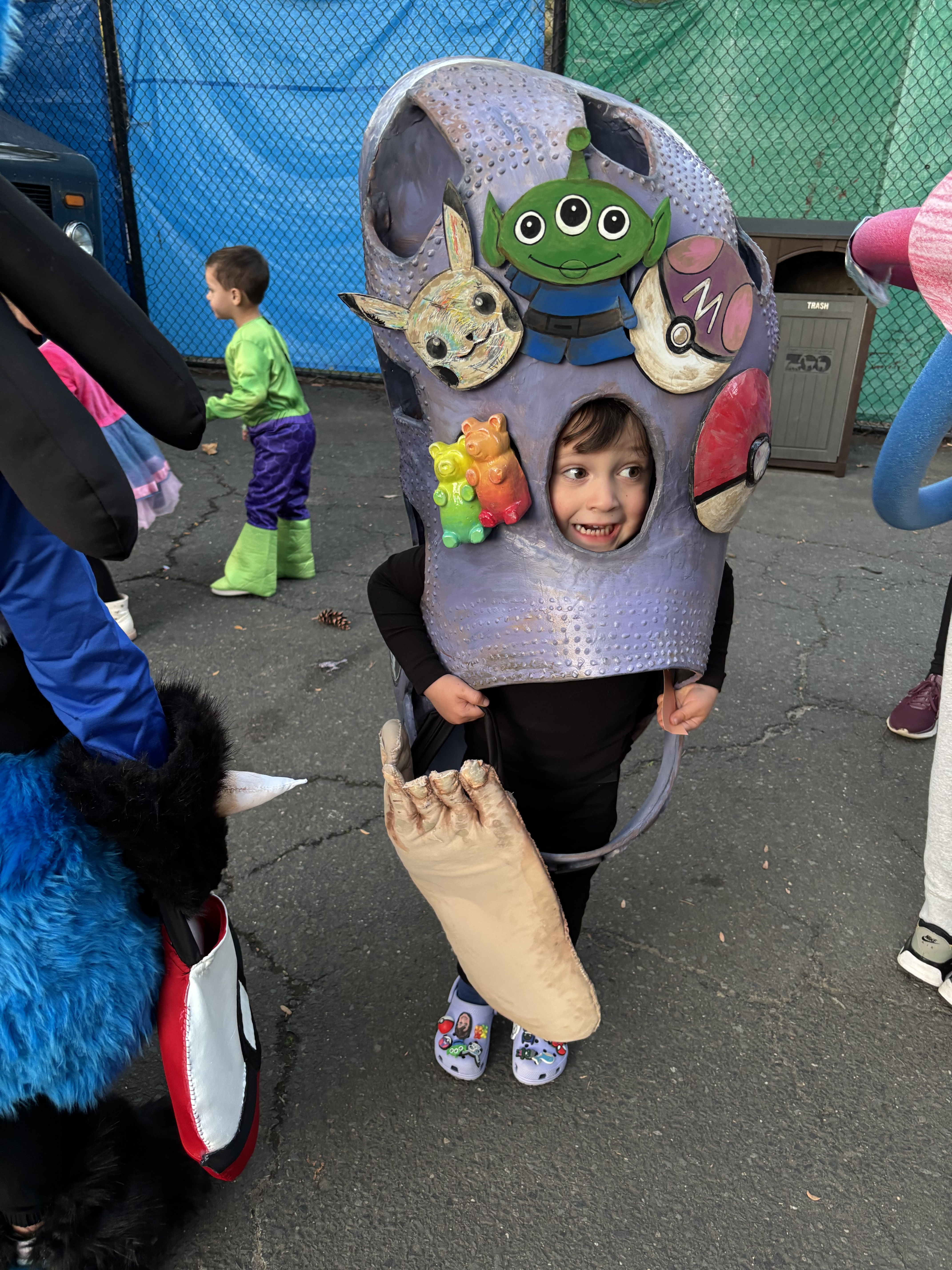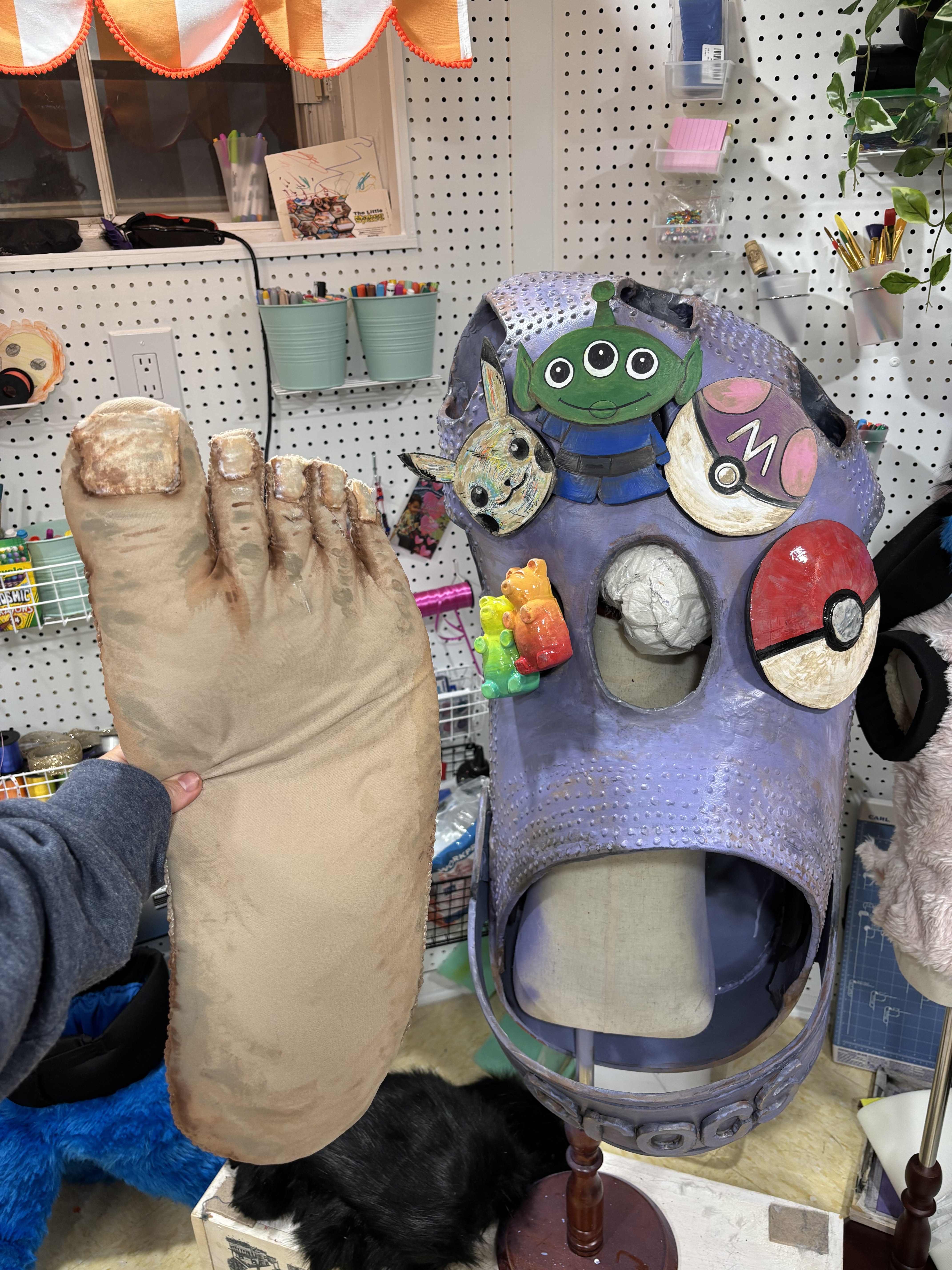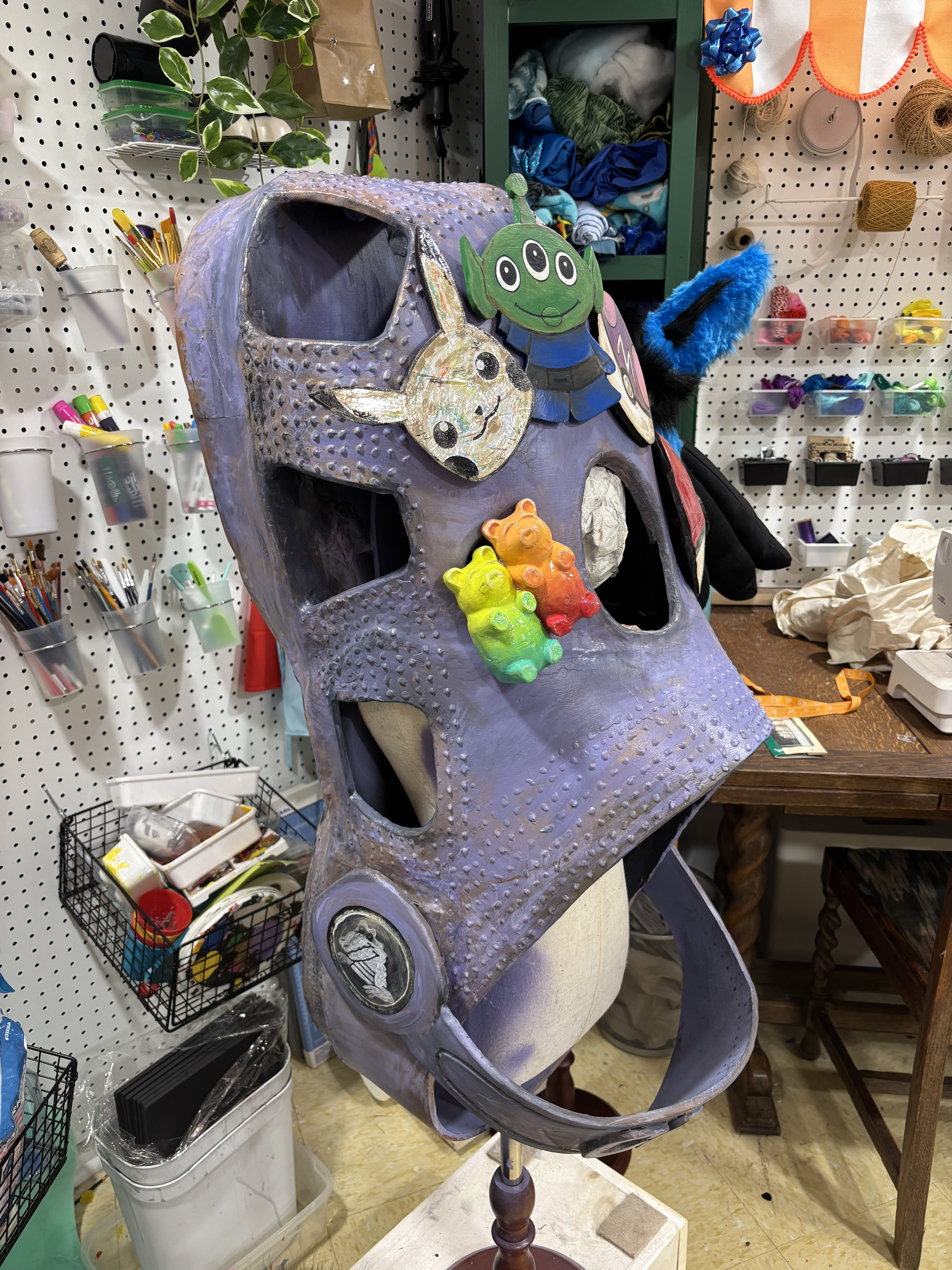 My toddler son was a stinky foot for halloween last year, and this year he evolved into a stinky croc -- but not just any croc, he wanted to be his exact croc with matching jibbitz, just 'stinky'. We completed the look with a custom stinky foot candy bag, and added a jibbit of his face to his croc, because if he is dressed up as his croc, shouldn't his croc also be dressed up as him? The croc was made out of EVA foam, foam clay, and acrylics.