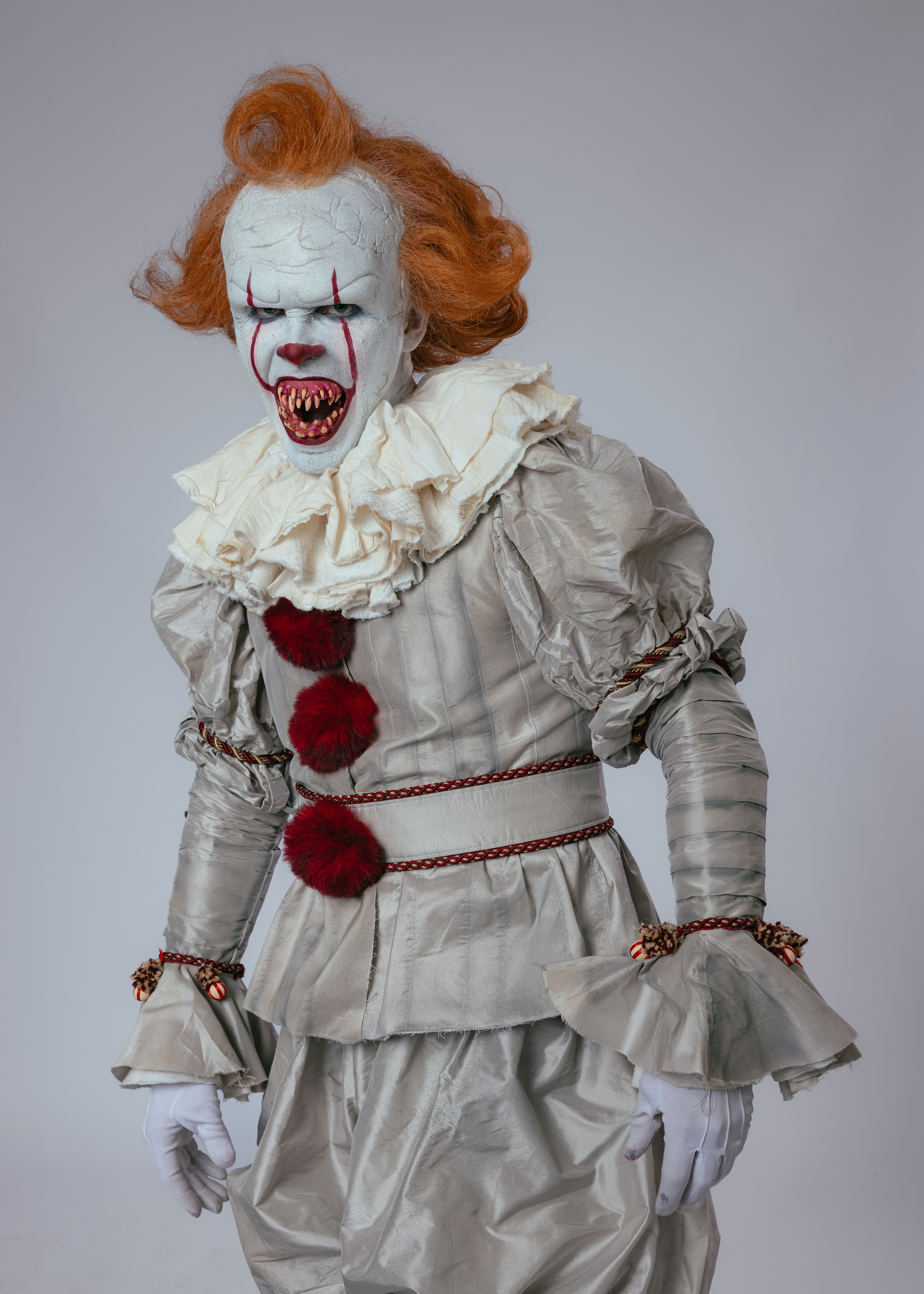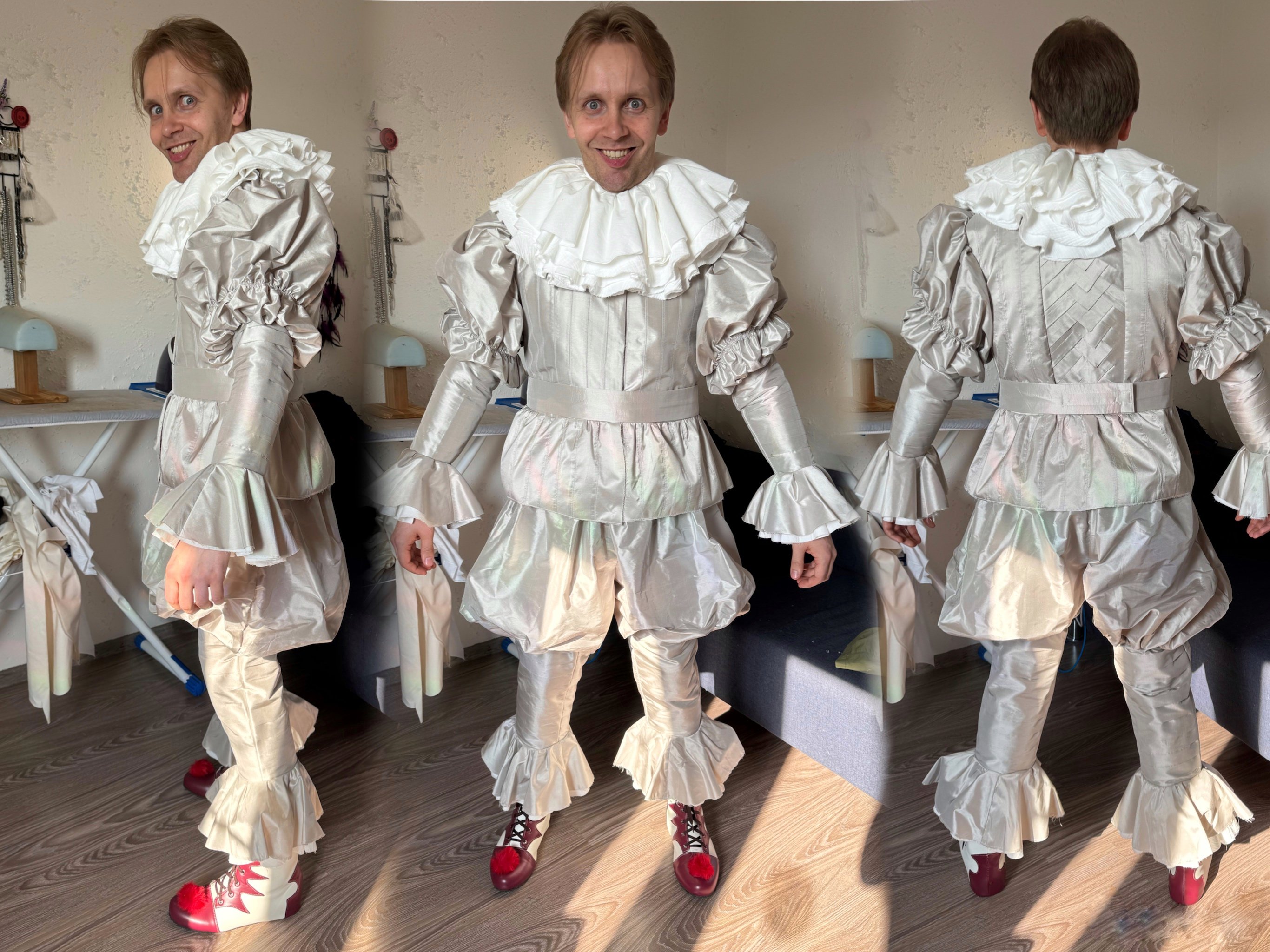 movie 2017 costume designer Janie Bryant where I found an info about what fabric they used for Pennywise costume and I found almost the same fabric for myself. Indian silk dupion. And my tailor helped me bring this costume to life. Then I sew on top details and weathered costume.