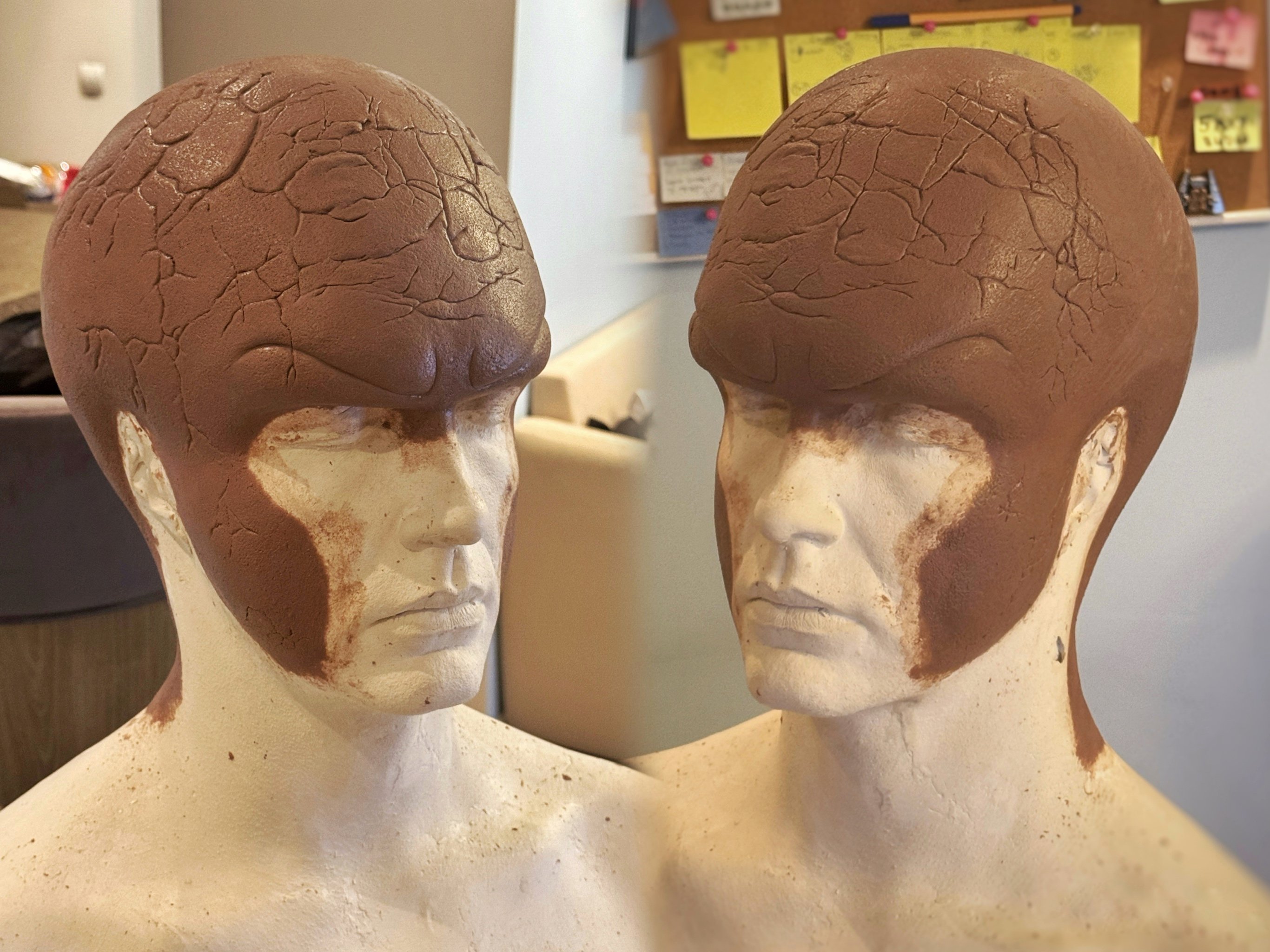 I decided to cut the head into four pieces and this technique is new for me - foam latex cowl, incapsulated silicone forehead and two silicone cheeks.