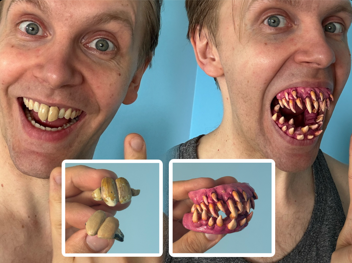 Also I made teeth - rabbit ones and shark ones. Sculpted it on top of plaster copy of my teeth, mold it with silicone and cast it with acrylic resin.