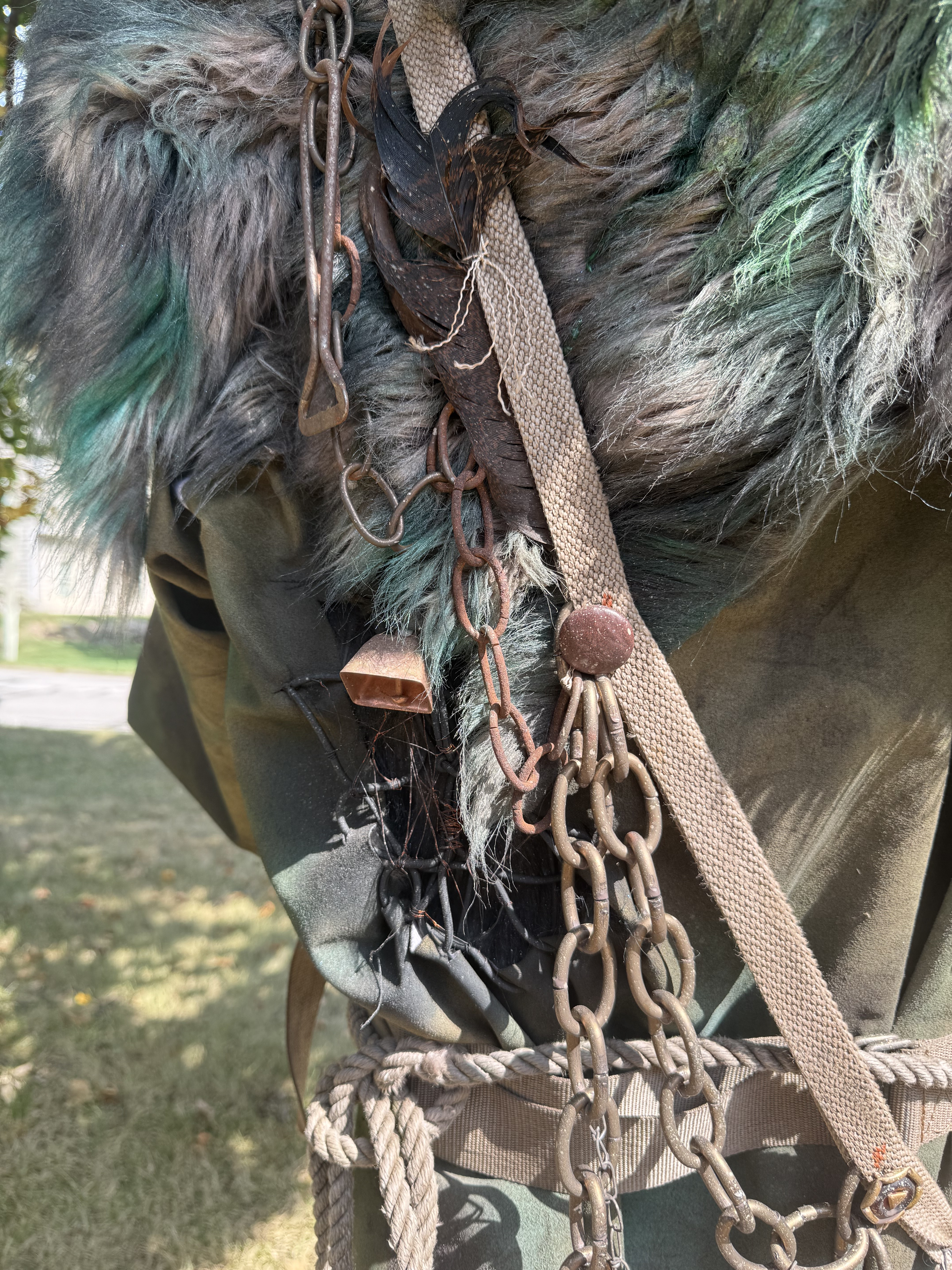 The chain sash was built from a broken ratchet strap, folded and sewn for reinforcement. It features antique metal accents such as a lamp topper, bottle opener, and chains.