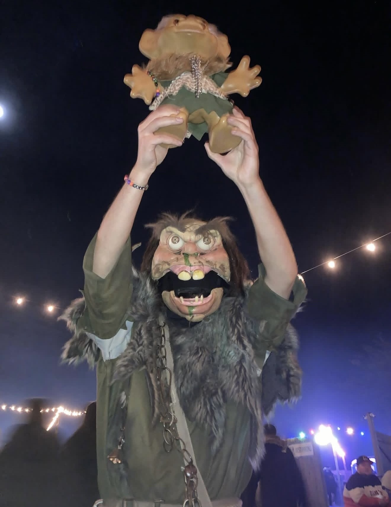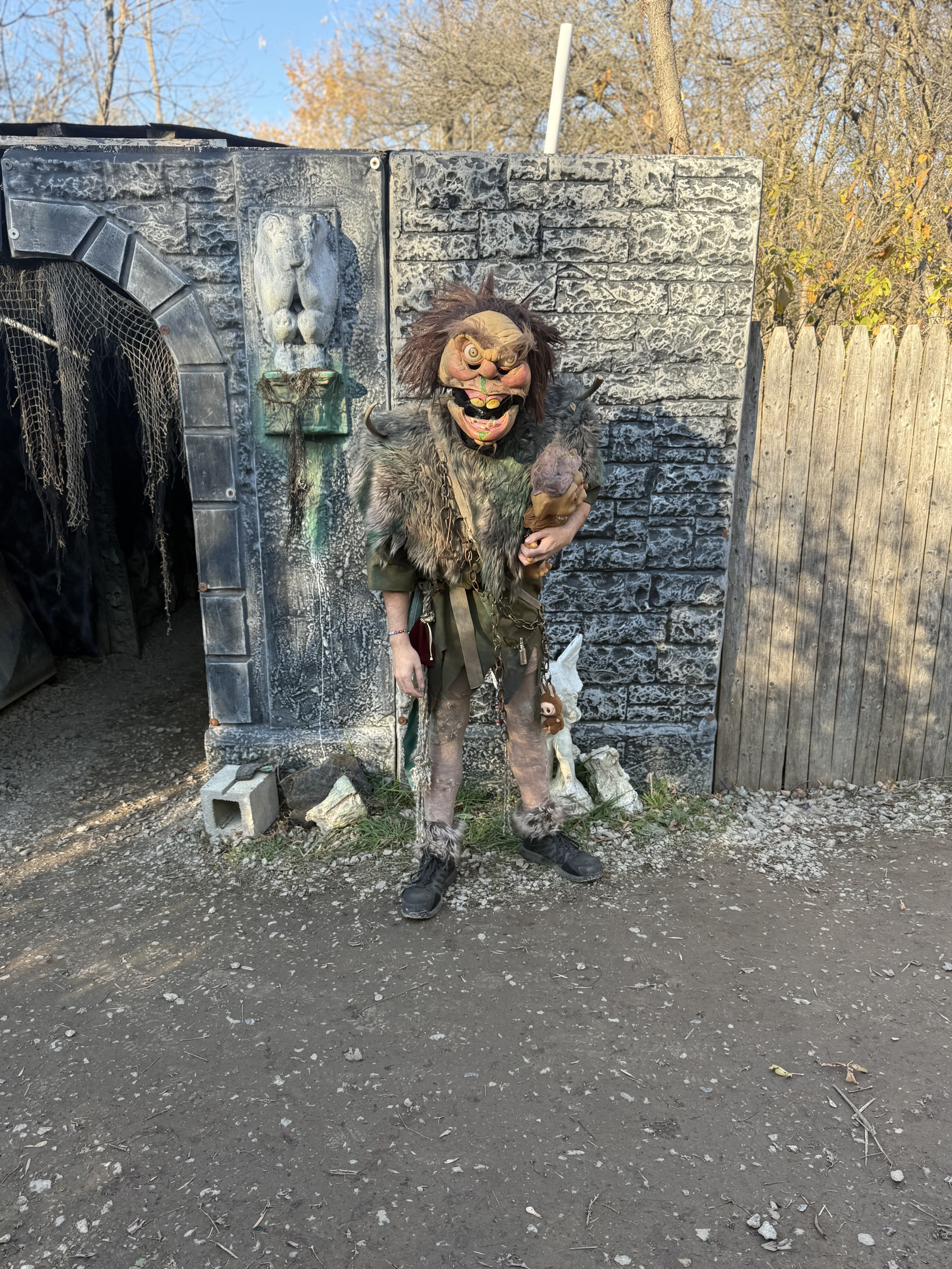 This is a new character built for the 2025 haunt season, created specifically for Scarefest Scream Park. Gaba the Ghoul & Guppy performed live nightly as part of a working haunted attraction, appearing on the haunted hayride, greeting guests in the midway, and featured every night during the Monster Meet & Greet stage show.