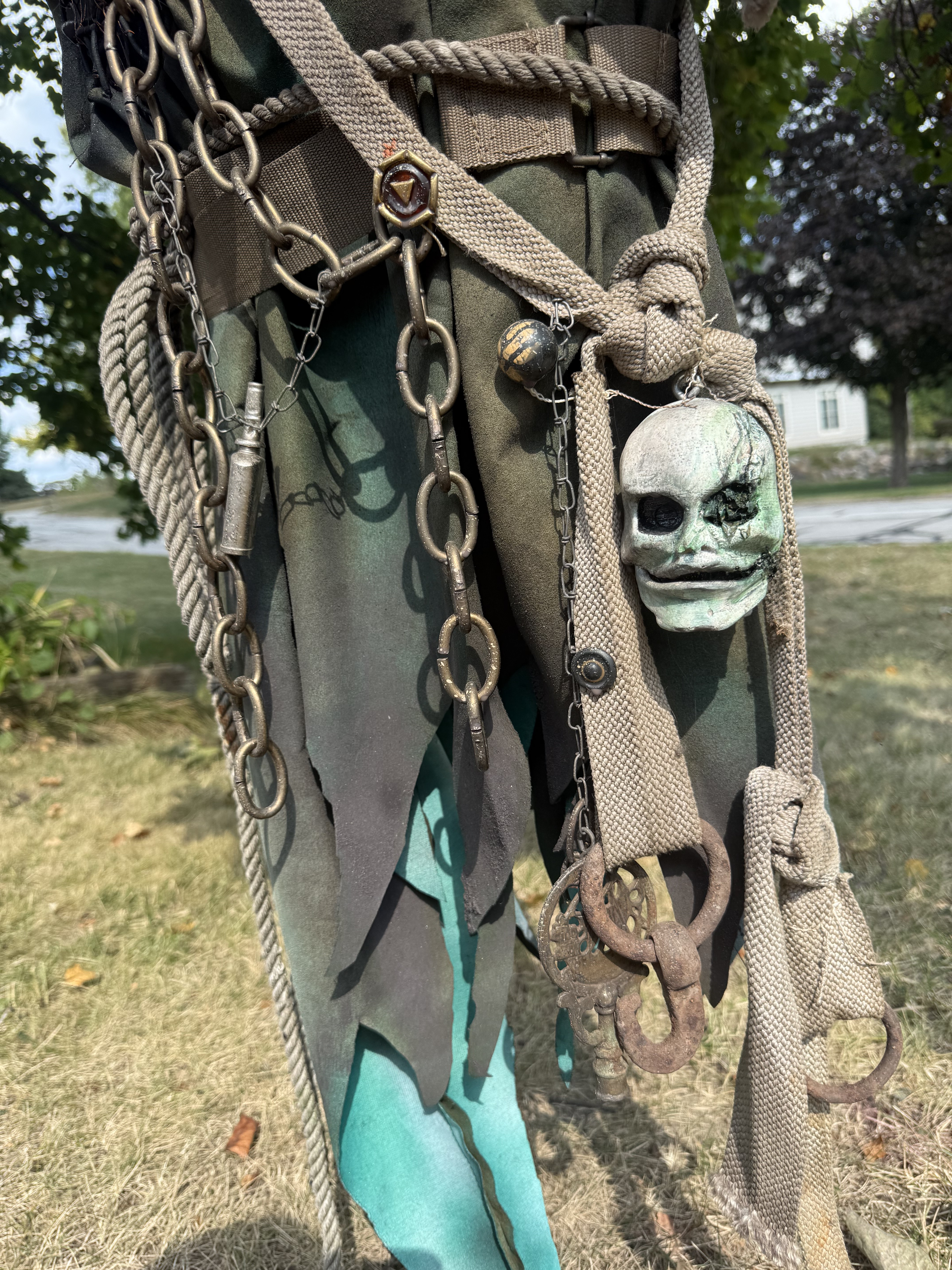 A thin metal rod connects the two pieces, allowing jaw articulation. After sanding and detail work, I painted the piece using model paints to achieve a water-rot effect, added moss in the eye sockets, and sealed it with a gloss coat before attaching it to the sash.