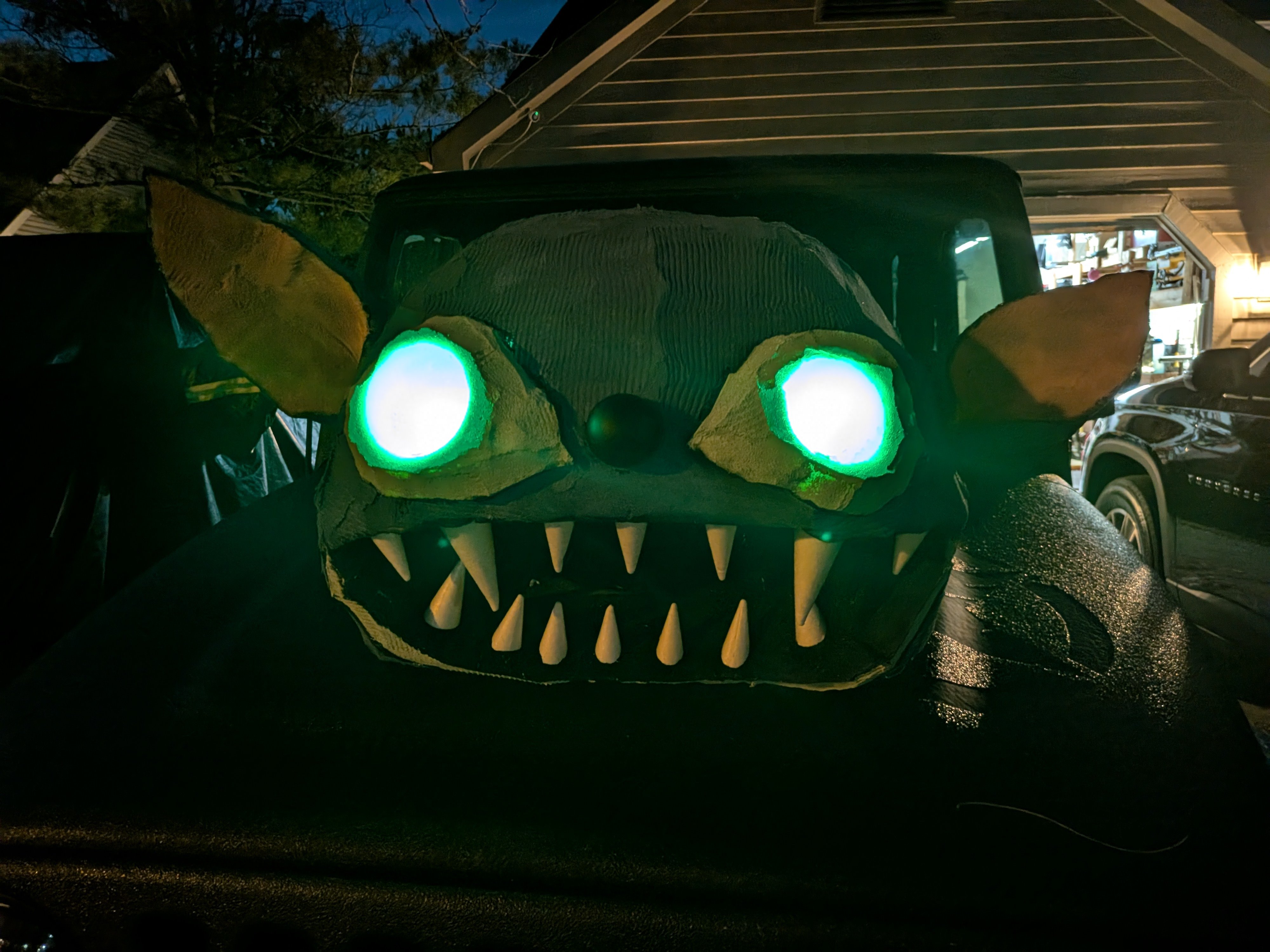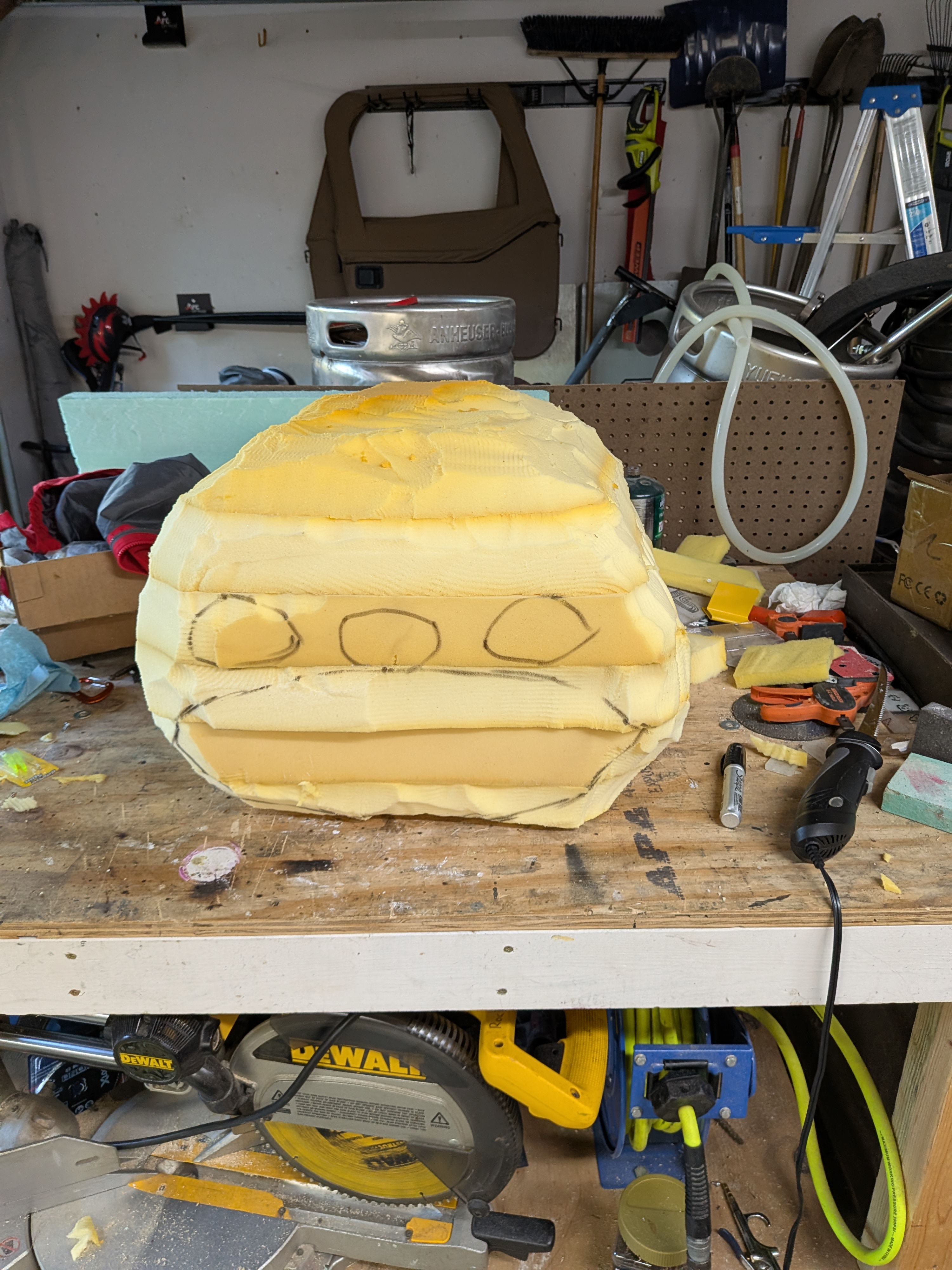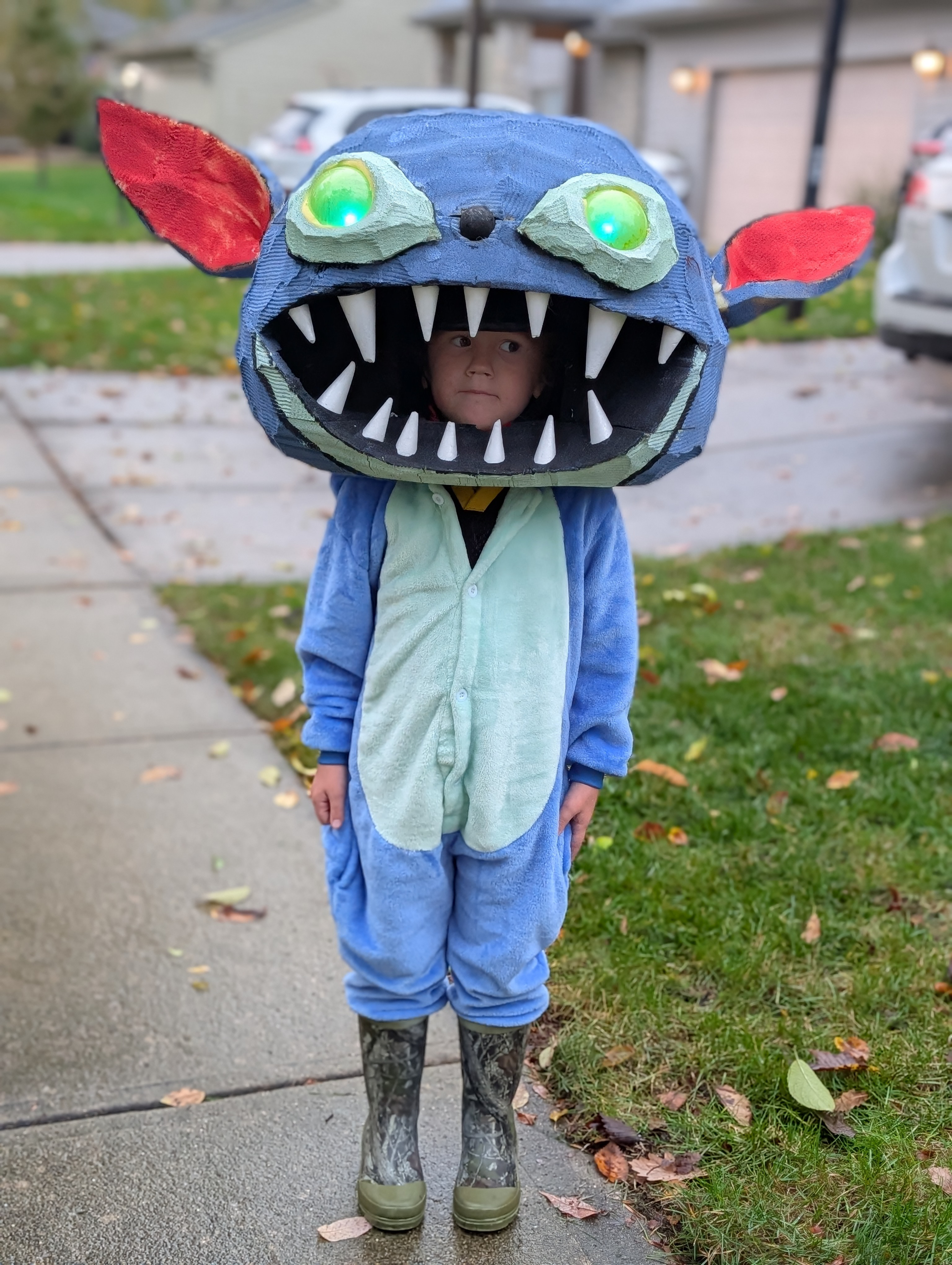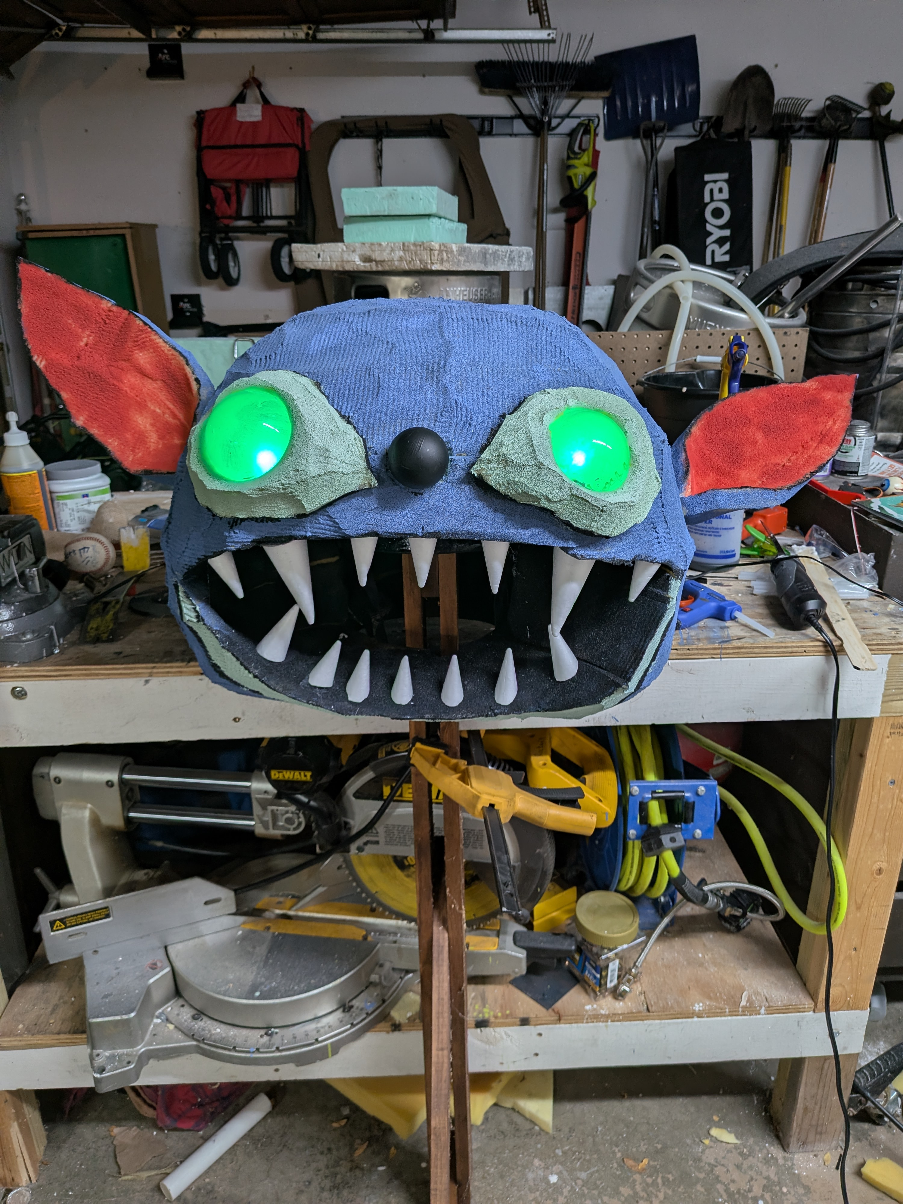 My four year old wanted to be Glitch Stitch for Trick or Treat. Over the summer a neighbor was throwing out a bunch of foam so I grabbed it all for future projects, and this head is made entirely out of that. I started with six pieces of foam stacked, and I carved it all using an electric filet knife. The eyes are two halves of a plastic globe ornament, illuminated by LEDs. I spray foamed in an old bike helmet for ease of wearing, and used Styrofoam cones for teeth.