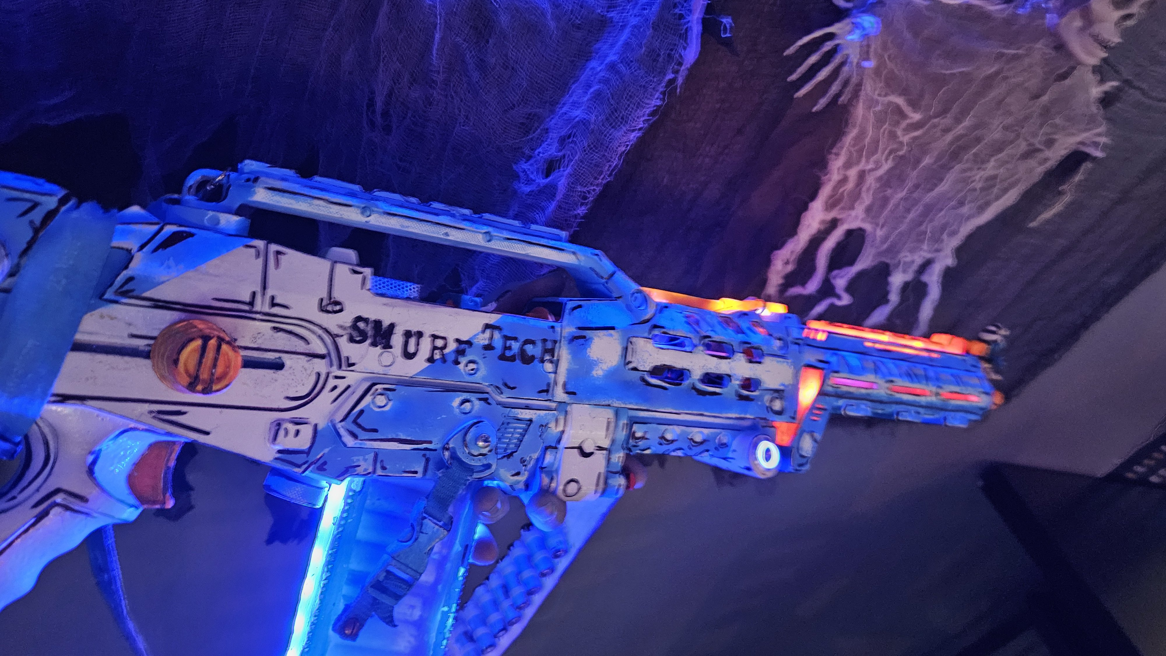 - The Smurf Tech rifle started as a nerf gun that I added leds, trigger, transparent battery clip, and stylalistic paint scheme! Very proud of how that turned out!