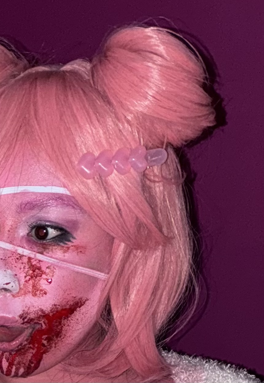 Build & Makeup: I hand-placed cotton using eyelash glue to form a realistic plush-fur texture, sealed it with barrier spray for structure, and layered pink tones from the Athena Water-Activated Palette and Mehron White Cloud for a soft yet dimensional base. I added a black plush-style nose with a white highlight on the bulb for toy realism.