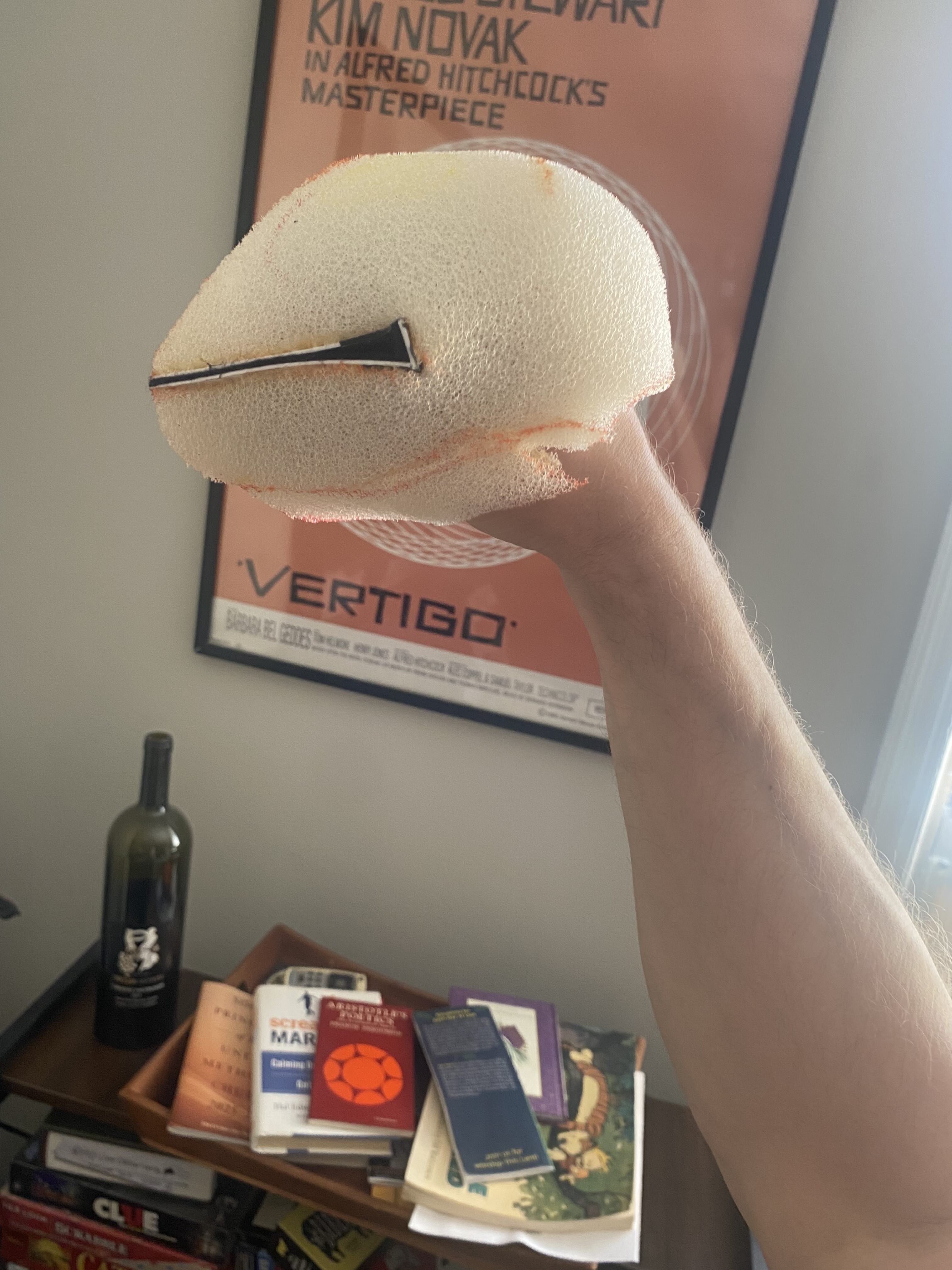 This morning I created a chest body out of 1/2 inch reticulated foam. The shape looked nice, but my fist couldn't fit through the neck opening. I could alter my pattern and expand the whole chest so my fist slides through, but I don't think that would look as good.