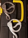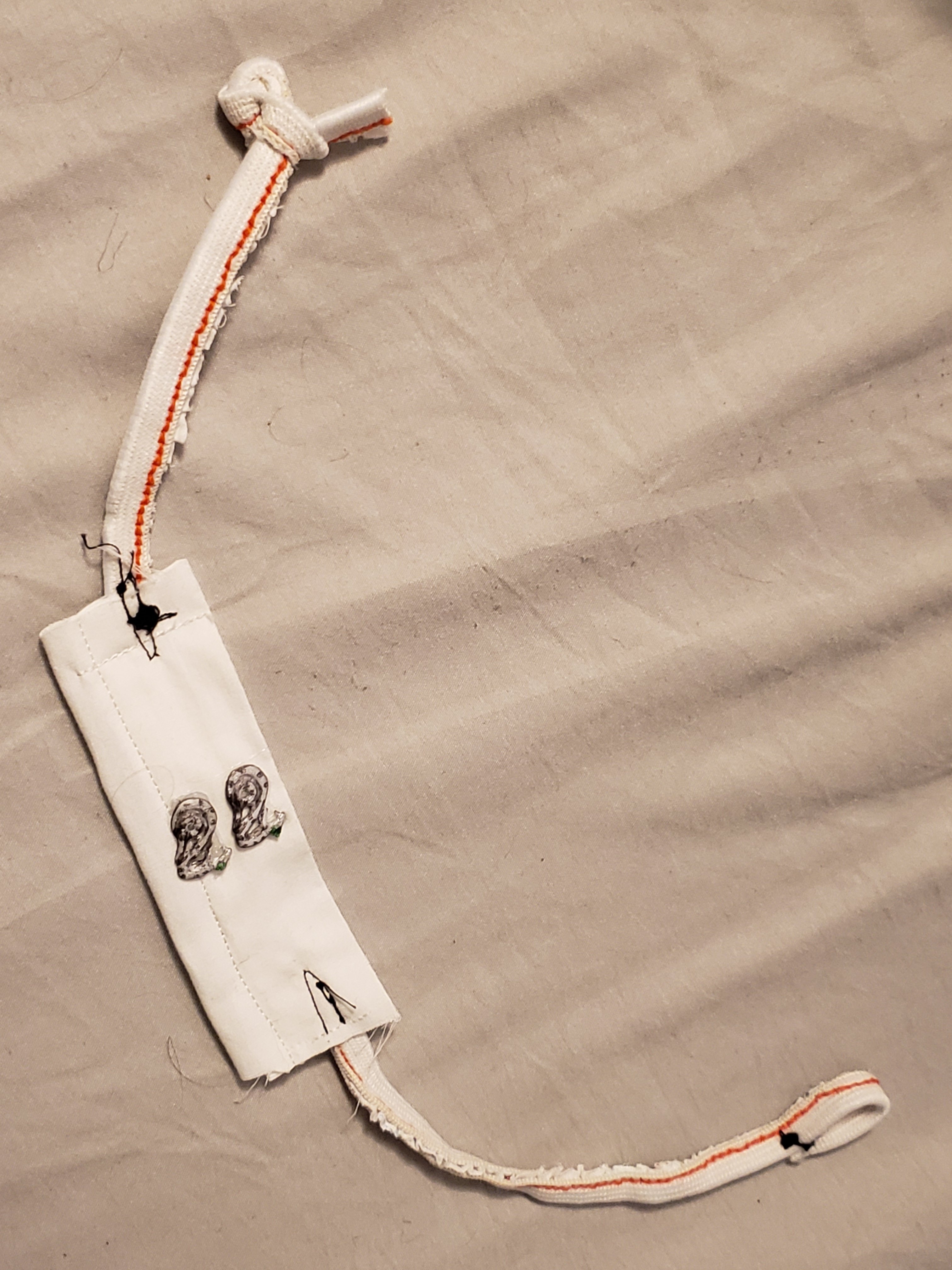 I created a faux collar. A short piece of white table cloth, folded top and bottom, was used to make a band type tie. To this I attached elastic fasteners that attached at the back of the neck. On the white, open facing, section, I placed the two cufflink toppers that I had made (later described). I put this on like a tie and laid the collar over this.